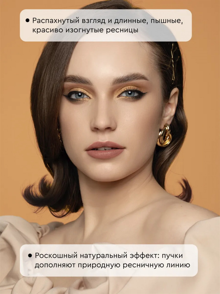 Пучки собраны из ресничек разной длины для имитации естественности. Современная синтетика гипоаллергенна и комфортна в носке. Пучки собраны на тоненьком основании анатомической формы, их очень легко и удобно приклеивать к веку. При корректной технологии приклеивания ресницы держатся долго и абсолютно не ощущаются на глазах.