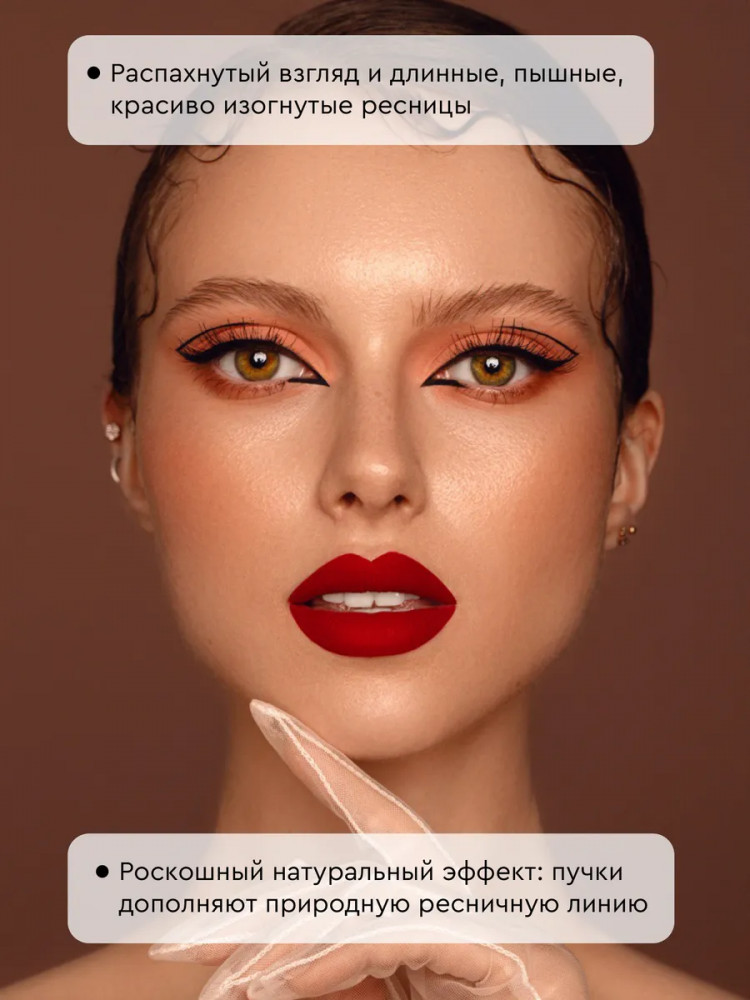Совет: чтобы сделать пленительный голливудский макияж глаз, наклеивайте ресницы от середины века к внешнему уголку, подбирая размер пучков под пропорции лица и исходную длину своих ресниц.