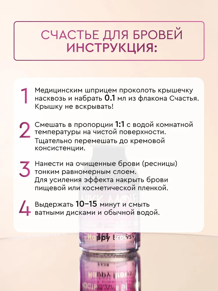 Способ применения: не вскрывая упаковку, при помощи шприца из бутылочки набирается продукт. Количество препарата, достаточного для выполнения одной процедуры, 0,1 мл. Смешать в пропорции 1:1 с водой комнатной температуры, в не металлической емкости. Тщательно перемешать до образования белой кремовой консистенции. Нанести на очищенные брови. Счастье для бровей наносится только на чистый волос. Время выдержки состава 10-15 минут. Для усиления эффекта накройте брови пленкой. По истечении 10-15 минут тщательно смойте «Счастье для бровей» водой. Не держите состав более 15 минут , максимальный эффект достигается за 15 минут, дольше держать не нужно! Процедуру можно выполнять после любого вида и техник окрашивания бровей, после процедур ламинирования, био фиксации, долговременной укладки, после 2го состава процедуры Био Фиксация / Ламинирование / Долговременная укладка (2й состав необходимо обязательно смыть водой).