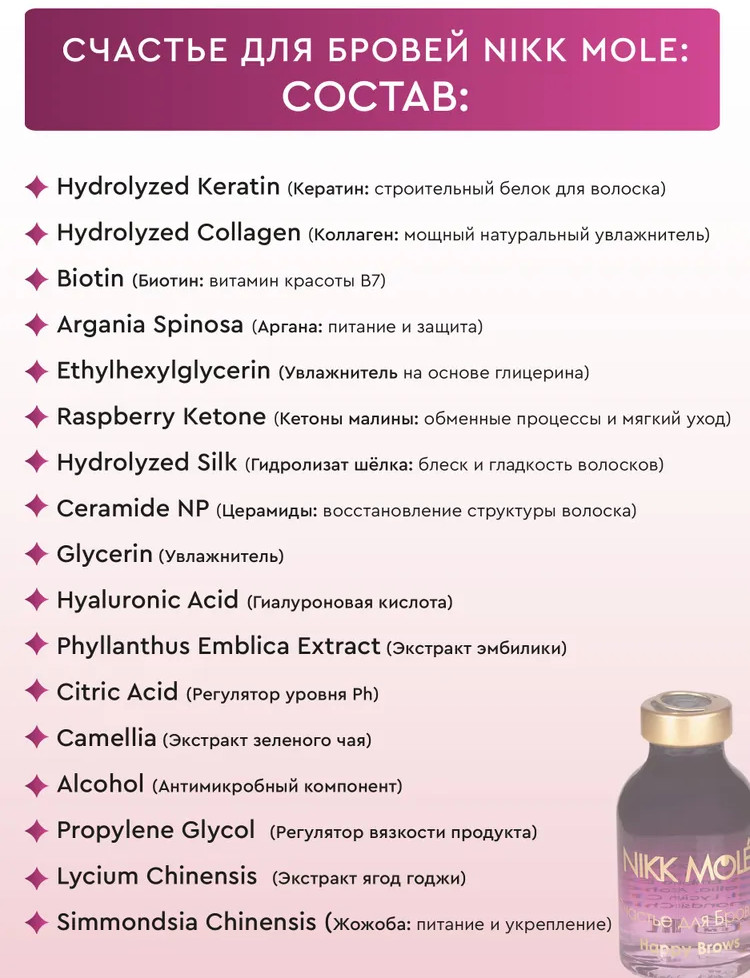 В данный момент этот товар отсутствует в продаже. Возможно, у нас найдется аналогичный или похожий товар здесь. Счастье для бровей — процедура восстановления бровей, уникальная формула: восстанавливает, питает, увлажняет, стимулирует рост волосков, придаёт блеск, улучшает стойкость окрашивания, защищает от агрессивного воздействия внешних факторов, восстанавливает после химических повреждений.