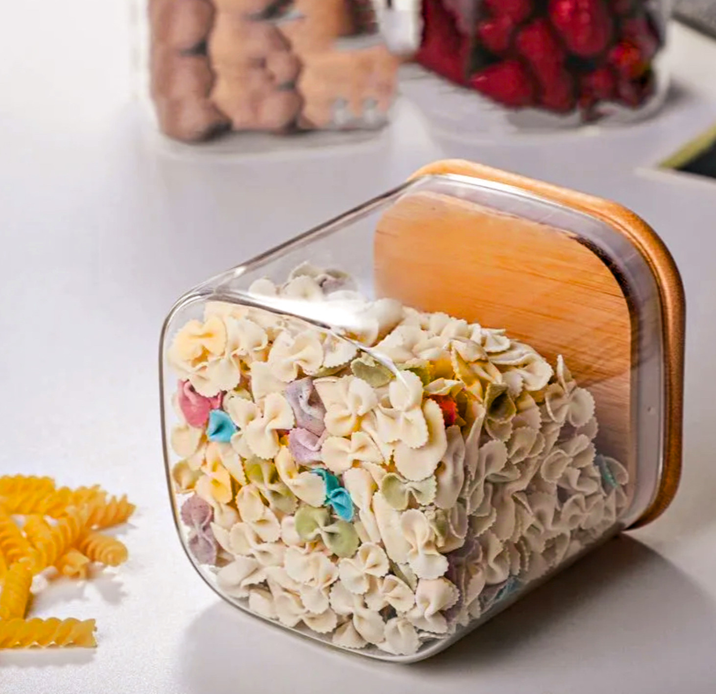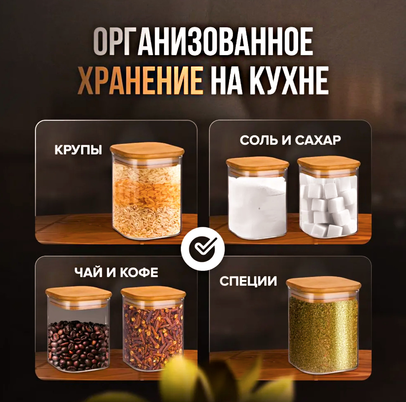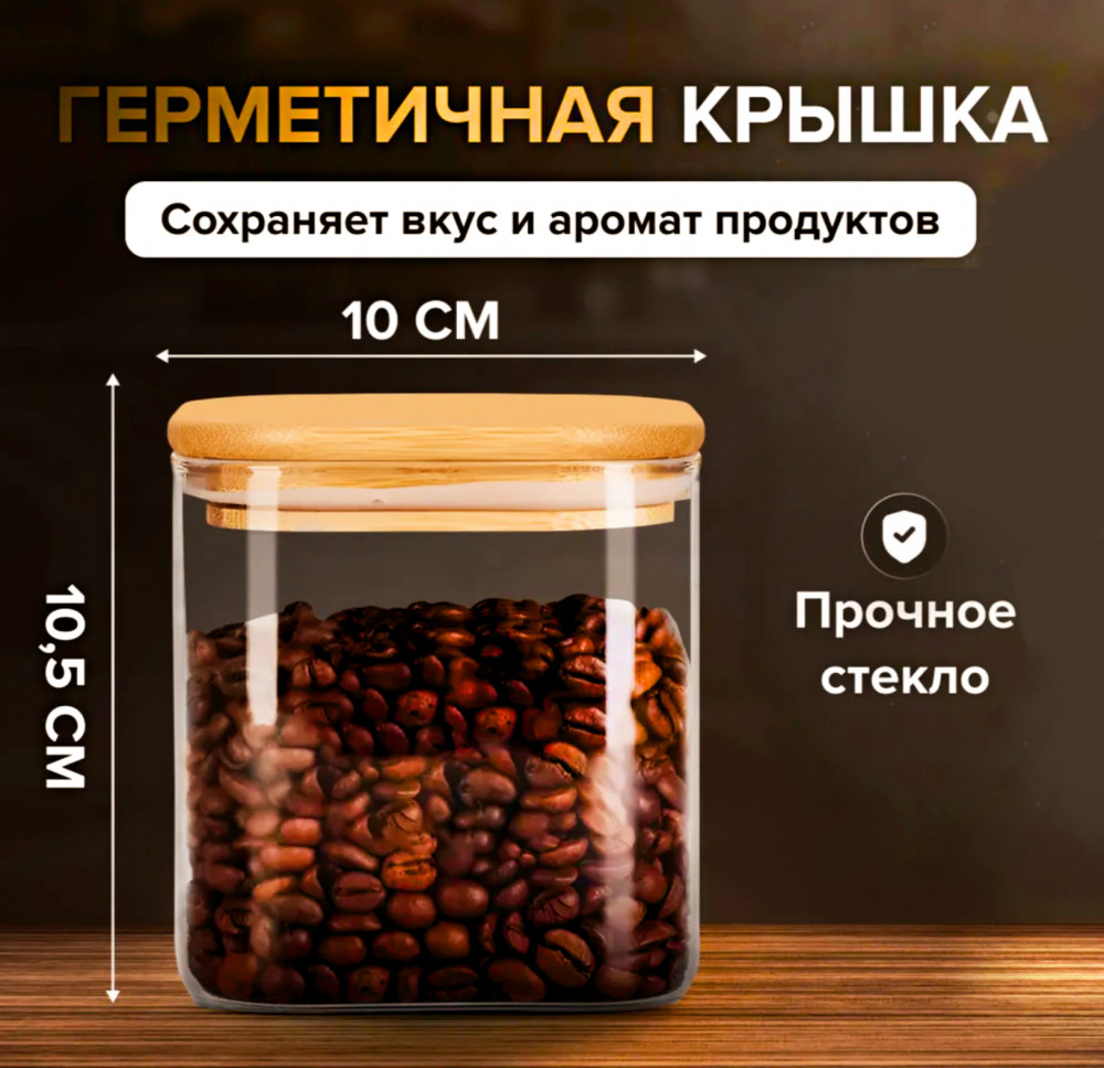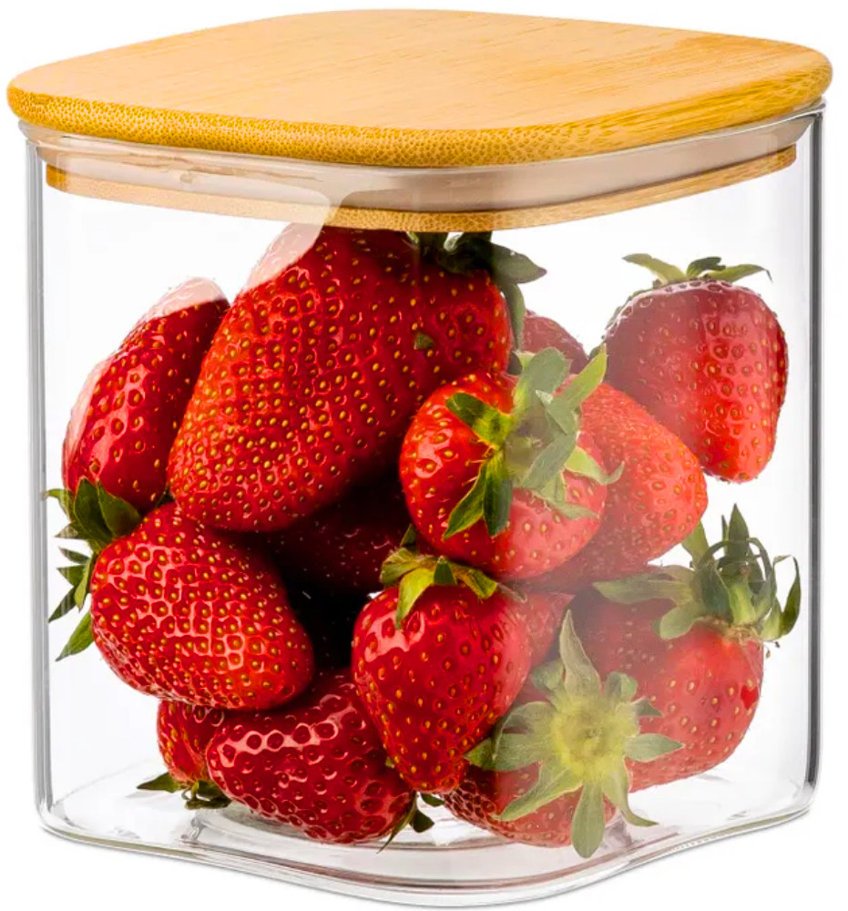 Квадратная форма банки не только выглядит эстетично, но и позволяет легко определить содержимое, что помогает экономить время и вовремя пополнять запасы. Крышка плотно закрывается благодаря силиконовой прокладке, защищая продукты от влаги и посторонних запахов.