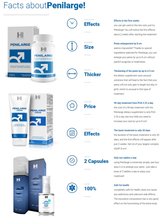 Вся серия продуктов Penilarge состоит из капсул, крема, геля и спрея. Все продукты серии безопасны и чрезвычайно популярны. Капсулы используются как основа лечения. И крем как его комплексная поддержка. Гель также можно использовать во время полового акта, как и спрей, также действующий временно, увеличивая объем головки полового члена.
