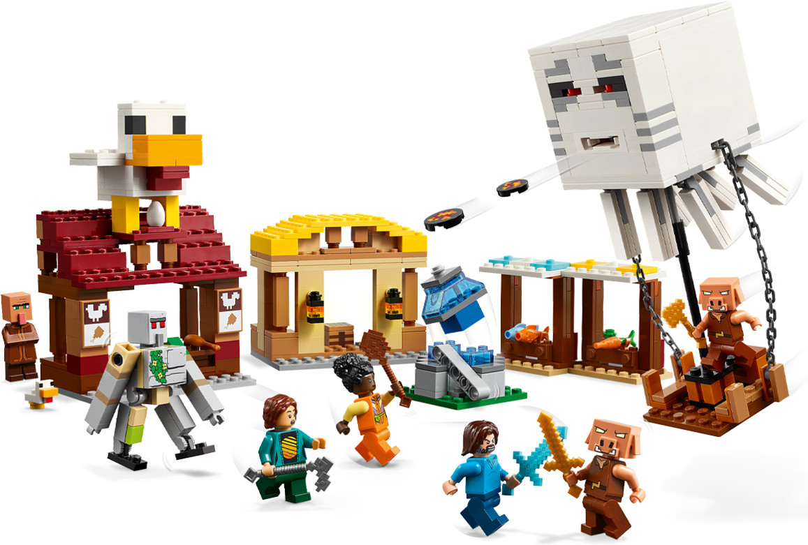 • игрушка Minecraft® фигурки — в этот набор для видеоигр входят минифигурки Стива, Натали, Доун и одного деревенского жителя, а также воздушный шар-призрак, цыпленок, 2 поросенка и фигурка железного голема, которую можно приобрести в виде набора LEGO® для видеоигр. Когда пиглины запускают ракеты из своего воздушного шара ghast, в результате чего фонтан «взрывается», дети должны защитить жителей деревни и ресторан Steve’s fried chicken и мастерскую крафта. Интерактивная игрушка — на крыше ресторана установлена большая модель курицы, которая включает в себя забавную функцию откладывания яиц;