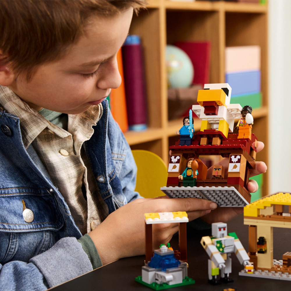 В наборе представлены популярные персонажи видеоигры: Стив, Натали, Дон, 2 поросенка, воздушный шар-призрак, деревенский житель, цыпленок и фигурка железного голема. В воздушном шаре есть место для поросят, а также дисковая стрелялка. В деревне расположены рыночные прилавки, ресторан Steve’s fried chicken, его мастерская по изготовлению крафта и фонтан, который дети могут «взорвать» с помощью встроенной функции. На крыше ресторана установлена большая модель курицы, которая включает в себя забавную функцию откладывания яиц. Для развлечения в цифровом формате приложение LEGO Builder позволяет детям увеличивать масштаб, поворачивать модели в 3D и отслеживать их прогресс.