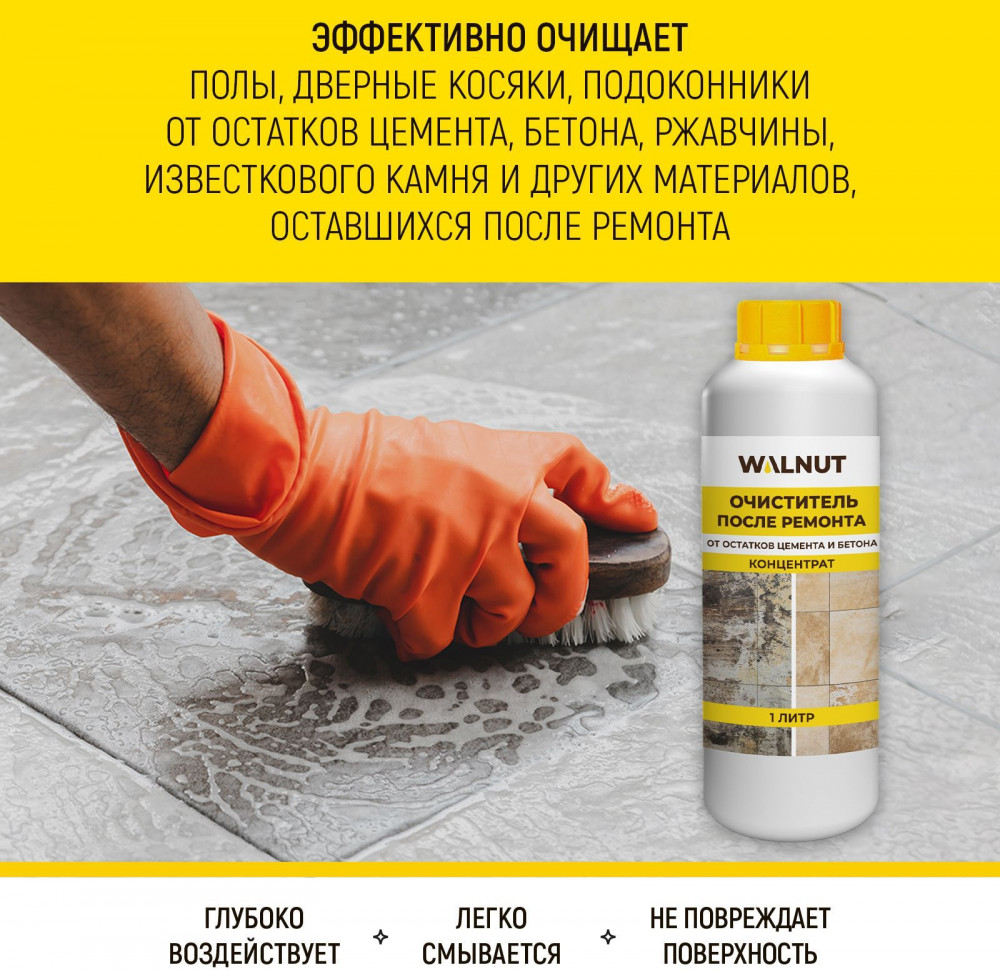 Очиститель после ремонта предназначен для эффективной очистки полов, дверных косяков, подоконников и других поверхностей от остатков цемента, бетона, ржавых пятен, известкового налета и других материалов, оставшихся после ремонта, идеально подходит в качестве растворителя плиточного клея, качественно удаляя следы затирки на кафельной плитке. Удалитель цемента подходит для устранения ржавчины и подготовки металлических поверхностей под подкраску. Расход средства: 150–350 г/м². Растворитель цемента содержит уникальную смесь органических и неорганических кислот, которые проникают глубоко внутрь остатков бетонных растворов, красителей, клея и разрушают их на молекулярном уровне. Подходит для внешних и внутренних работ: для очистки бетона, стекла, камня, керамической плитки, нержавеющей стали, посуды, керамогранита, кирпича и сантехники.
