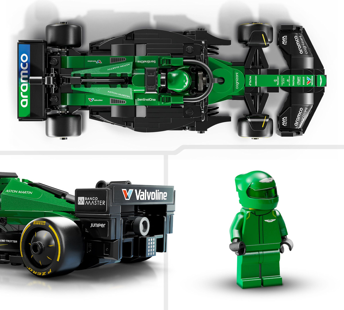 • подлинные детали Aston Martin Aramco F1® — модель, в которой использованы детали настоящего гоночного автомобиля Формулы-1 2024 года, включая заднее антикрыло, накладку—ореол, спонсорские наклейки и более широкие задние шины с надписью «Pirelli»;