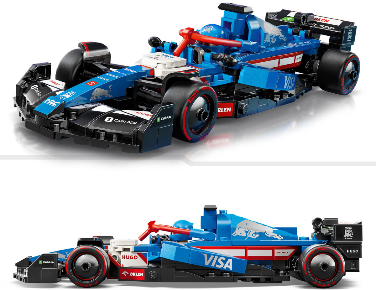 Автомобиль модели F1 включает в себя кокпит, который открывается при поднятии балки, заднее антикрыло, подвеску на поперечных рычагах, спонсорские наклейки и более широкие задние шины с надписью «Pirelli». Гоночный автомобиль Формулы-1 также поставляется с минифигурой пилота, одетой в форму RB, и крылатым шлемом, который можно разместить в кабине пилота. После сборки модель автомобиля Формулы-1 будет отлично смотреться на витрине.