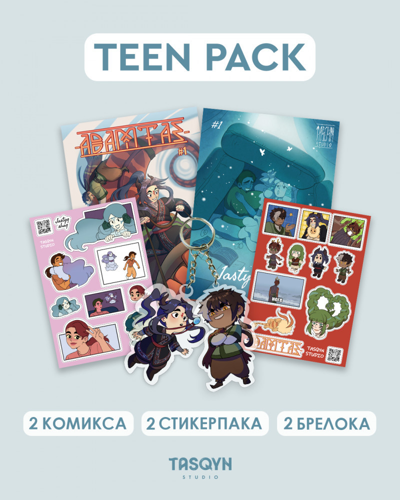 Подарочный набор «Teen Pack»В данный момент этот товар отсутствует в продаже. Возможно, у нас найдется аналогичный или похожий товар здесь. Теперь доступен подарочный набор по комиксам Адамтас и Жастық Шақ. В него входят — комиксы Адамтас и Жастық Шақ, с первыми главами (2 шт.), стикерпаки по комиксам Адамтас и Жастық Шақ (2 шт.), 2 брелока по комиксам Адамтас (Аман и Бокей). |