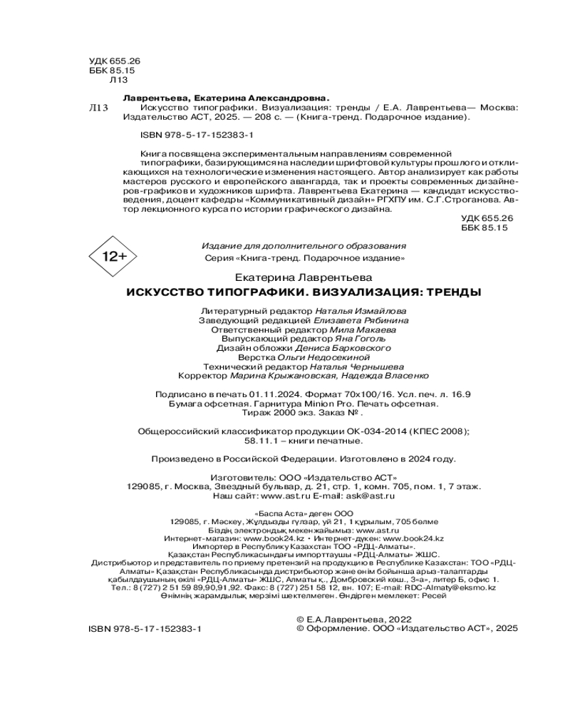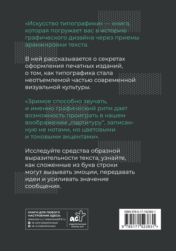 💳 Оплатить за товар можно при получении 🇰🇿 Есть бесплатная доставка по Казахстану от 1 дня 🎁 Копите бонусы с каждой покупки Серия: Книга-тренд. Подарочное издание «Искусство типографики» — это увлекательное погружение в мир книжного оформления и шрифтового дизайна. Книга прослеживает эволюцию типографики в 20-21 веках, демонстрируя, как она стала неотъемлемой частью современного искусства. Екатерина Лаврентьева, правнучка знаменитого фотографа Александра Родченко, иллюстратор и кандидат искусствоведения, раскрывает секреты завораживающего воздействия шрифтов, подчеркивая, что каждый из них обладает своим характером и способен служить метафорой для передачи глубоких эмоций. Типографика предстает здесь не просто как технический инструмент, а как истинное искусство, где печатное слово превращается в потрясающую визуальную симфонию. |