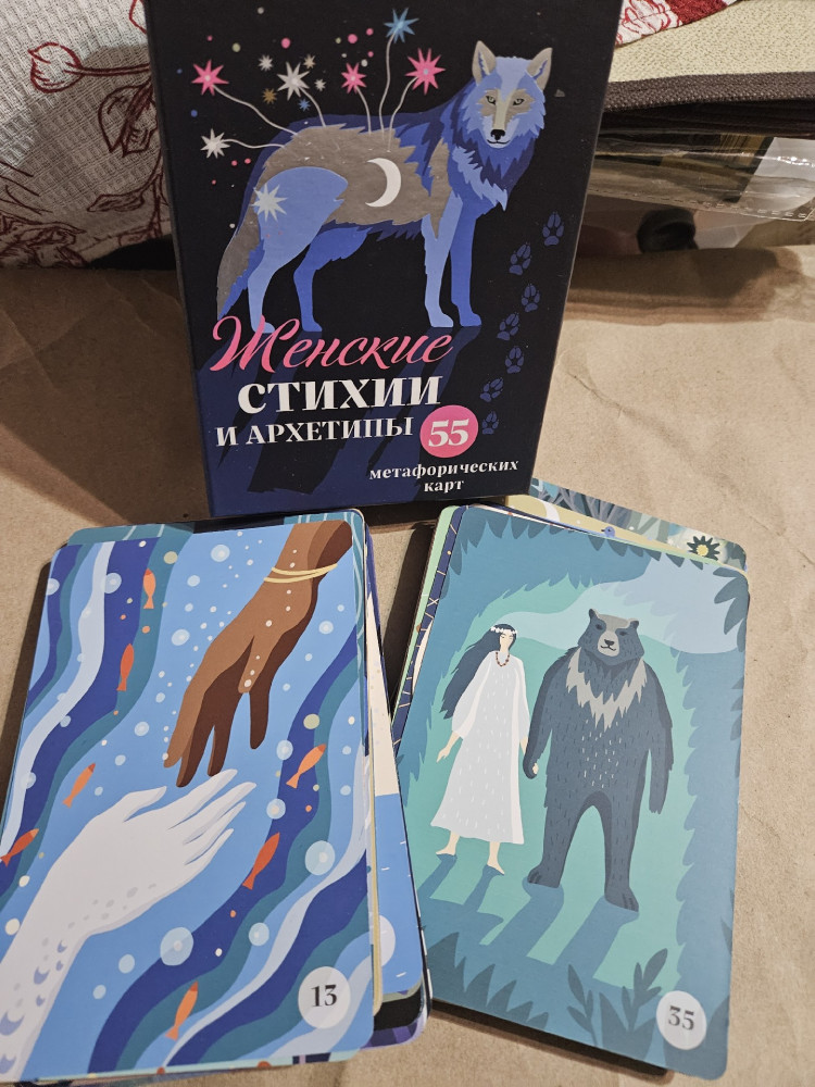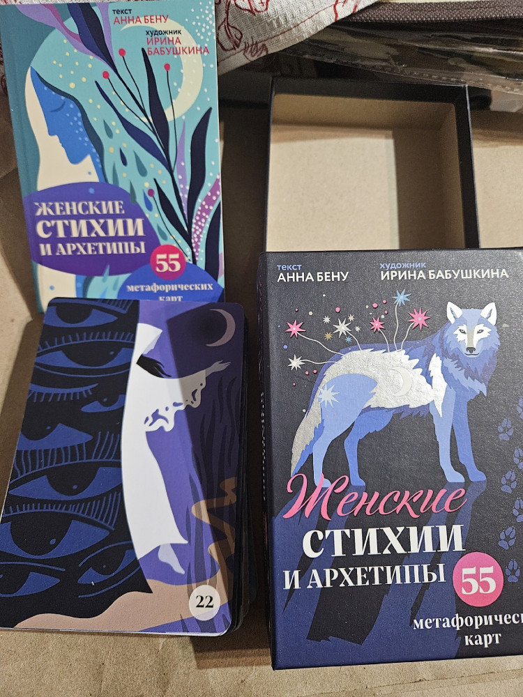 Большие карты упакованы в плотную коробку. Прилагается книжка с описанием карт и практиками. Рисунки необычные, заставляют мозг работать) Дополнительно покупала к картам книгу автора Анна Бену "Женские стихии". Телефон сам скорректировал свет - рисунки сделал яркими, чем на самом деле.