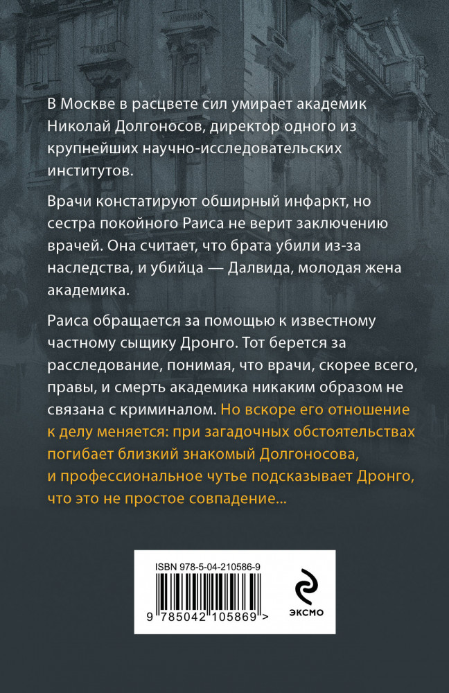💳 Оплатить за товар можно при получении 🇰🇿 Есть бесплатная доставка по Казахстану 🎁 Копите бонусы с каждой покупки Серия: Суперагент Дронго. Легенда российской бондианы В Москве в расцвете сил умирает академик Николай Долгоносов, директор одного из крупнейших научно-исследовательских институтов. Врачи констатируют обширный инфаркт, но сестра покойного Раиса не верит заключению врачей. Она считает, что брата убили из-за наследства, и убийца — Далвида, молодая жена академика. Раиса обращается за помощью к известному частному сыщику Дронго. Тот берется за расследование, понимая, что врачи, скорее всего, правы и смерть академика никаким образом не связана с криминалом. Но вскоре его отношение к делу меняется: при загадочных обстоятельствах погибает близкий знакомый Долгоносова, и профессиональное чутье подсказывает Дронго, что это не простое совпадение... |