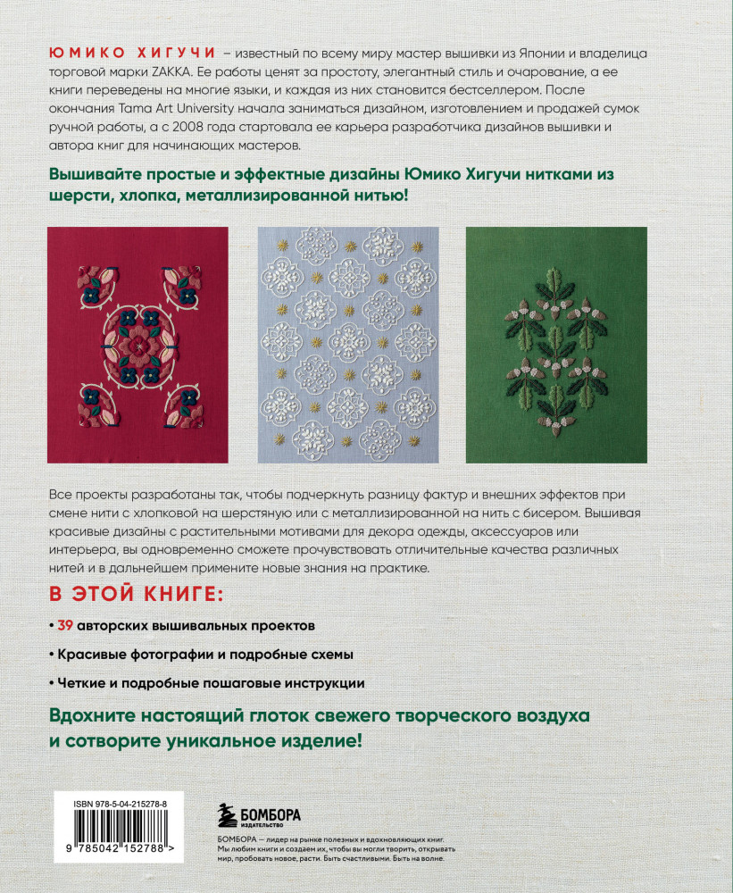 💳 Оплатить за товар можно при получении 🇰🇿 Есть бесплатная доставка по Казахстану 🎁 Копите бонусы с каждой покупки Серия: Звезды рукоделия. Бестселлер из Японии 39 уникальных сюжетов знаменитого японского мастера! Одна из любимейших коллекций Юмико Хигучи, вдохновленная окружающей природой. Растительный мир дает ее творческой фантазии непрекращающийся поток вдохновения: его цвета и формы прекрасно ложатся на полотно в виде уникальных дизайнов, одновременно простых и эстетически изысканных! Прелесть сюжетов Юмико Хигучи в том, что, неся в себе отголоски скандинавского стиля с его тягой к минимализму, они в то же время совершенно «японские» по тонкости исполнения, тщательности проработки, изысканности форм. |