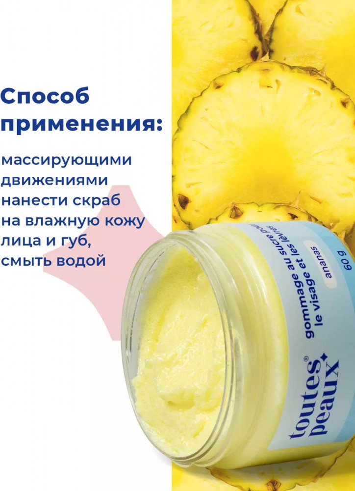toutes peaux Скраб для лица и губ сахарный «Ананас»В данный момент этот товар отсутствует в продаже. Возможно, у нас найдется аналогичный или похожий товар здесь. Увлажняющий сахарный скраб для ухода за нежной кожей лица и губ с приятным ароматом ананаса — это эффективная, но деликатная женская косметика, которая дарит ощущение свежести и сияния. Скраб аккуратно удаляет омертвевшие клетки, способствуя очищению кожного покрова. Экстракт ананаса в составе обладает омолаживающими, тонизирующими и осветляющими свойствами. Он помогает выровнять тон, устранить пигментные пятна и придает здоровое сияние, помогая продлить молодость и красоту кожи. А молочная кислота, также входящая в состав уходового средства уменьшает воспаления и сужает поры. |