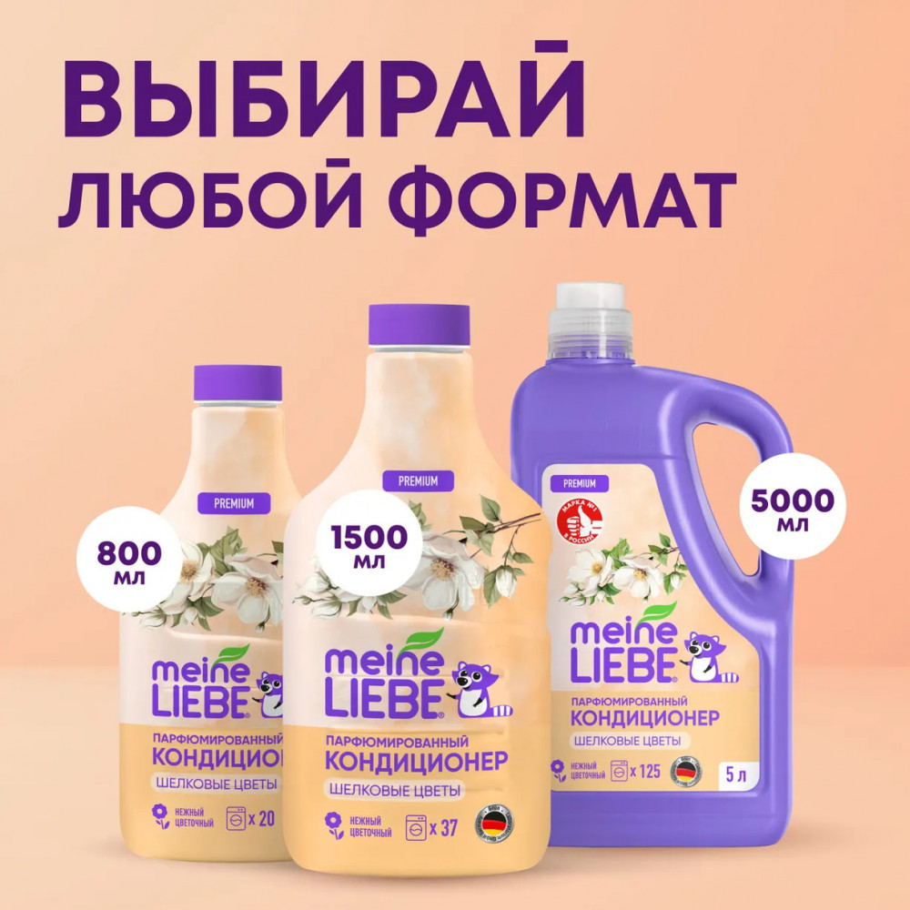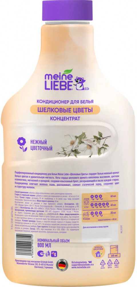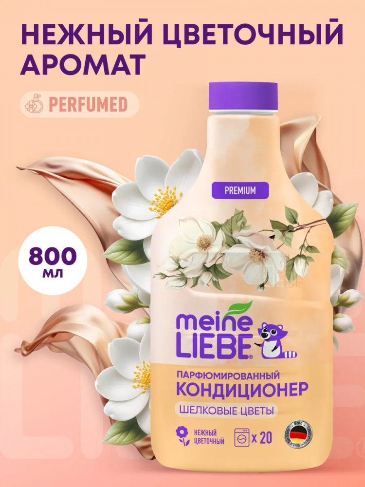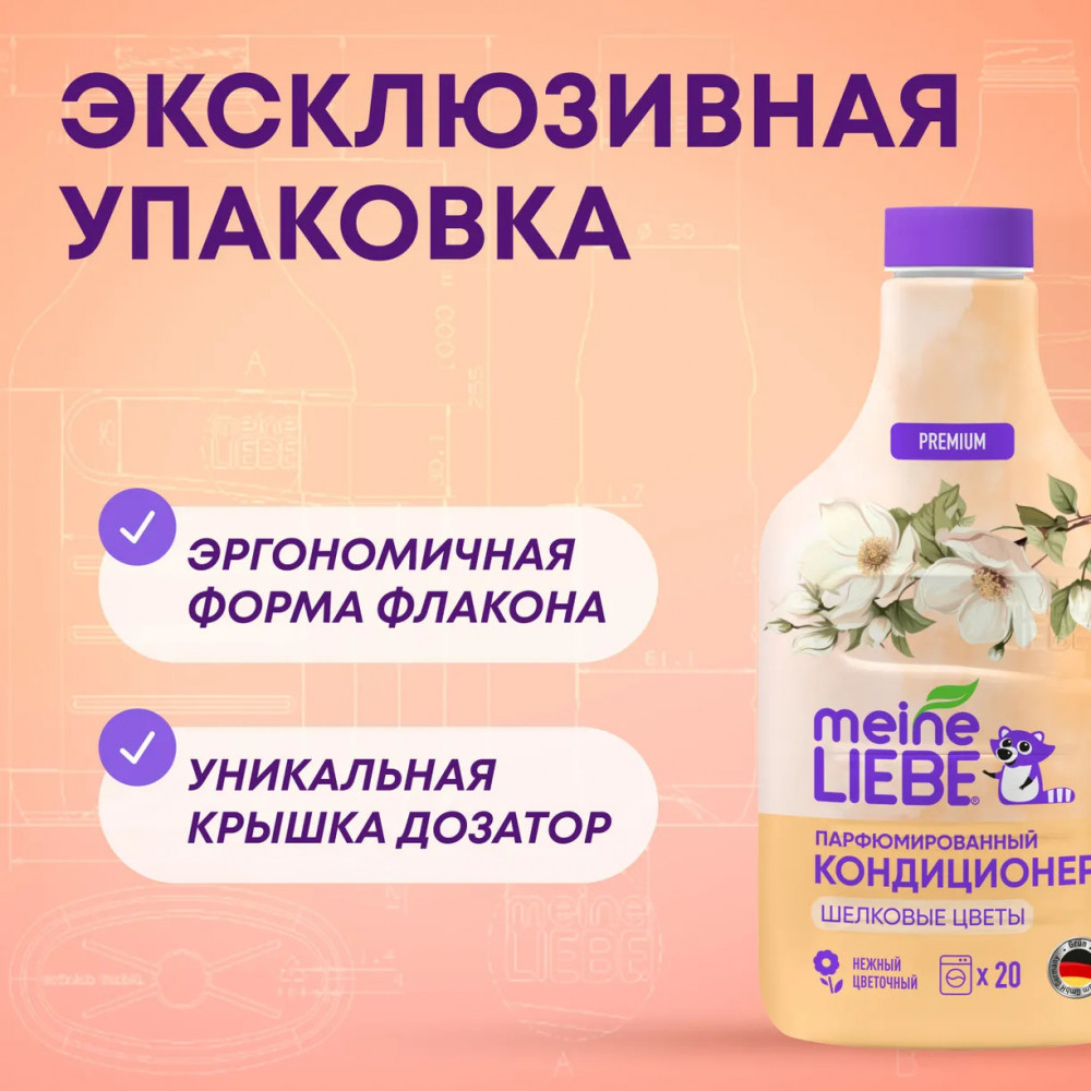 Meine Liebe представляет обновленную серию средств для стирки высшей категории. В серии парфюмерных кондиционеров для белья использованы специальные смягчающие компоненты и премиальные европейские отдушки. Многослойная цветочная композиция каждого кондиционера Meine Liebe подобрана таким образом, чтобы мягкий аромат сохранялся на одежде и белье надолго после стирки. Кондиционер для белья Meine Liebe «Шелковые Цветы» подарит белью нежный аромат белых цветов и удивительную мягкость. Ноты сердца шелкового аромата наполнены жасмином, цветком клементина и орхидеей, создавая изысканный букет, раскрывающийся после каждой стирки.