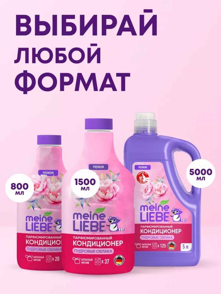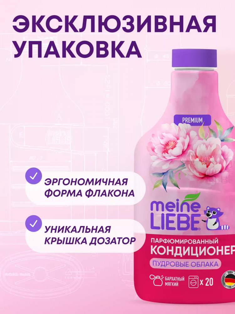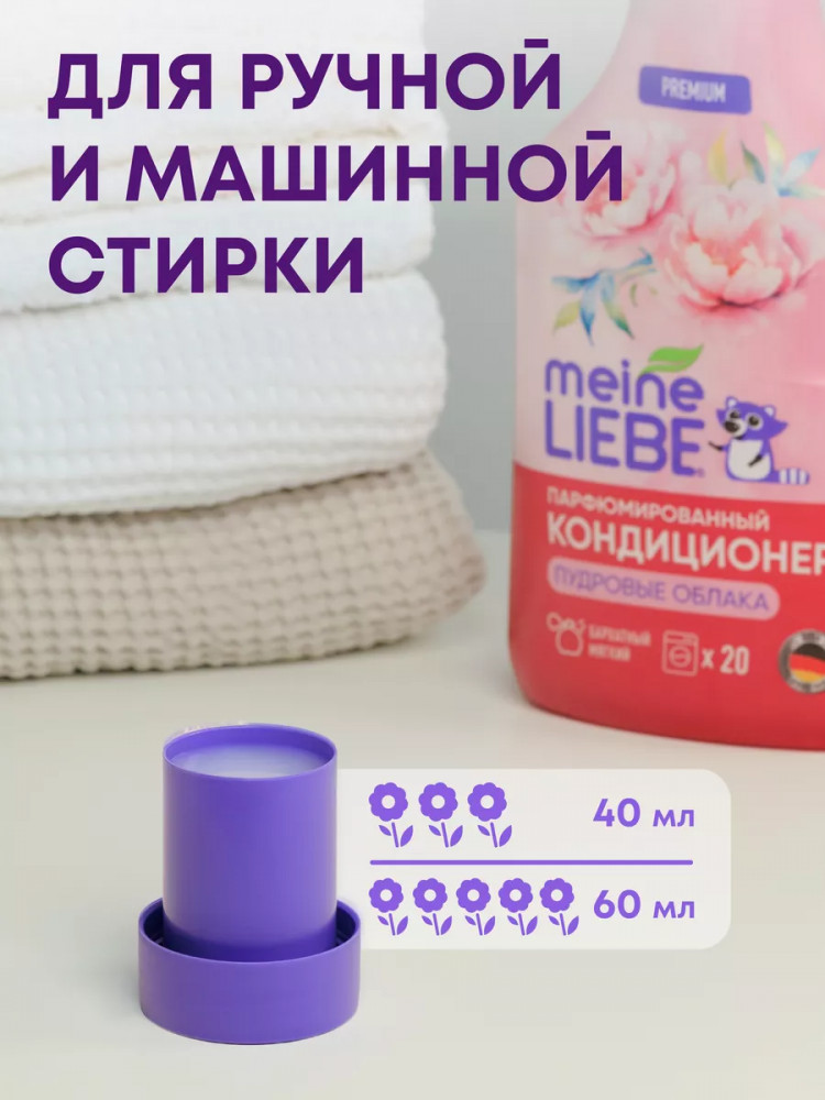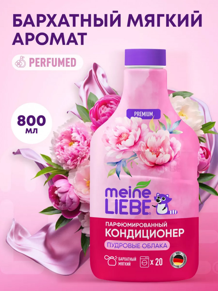 Meine Liebe представляет обновленную серию средств для стирки высшей категории. В серии парфюмерных кондиционеров для белья использованы специальные смягчающие компоненты и премиальные европейские отдушки. Многослойная цветочная композиция каждого кондиционера Meine Liebe подобрана таким образом, чтобы мягкий аромат сохранялся на одежде и белье надолго после стирки. Погрузитесь в мир роскошного бархатистого аромата с парфюмированным кондиционером для белья Meine Liebe «Пудровые облака». Ноты сердца наполнены ароматами сладких цветов жасмина и магнолии, и дополнены мягким пудровым аккордом мускуса и амбры, которые подарят белью изысканный глубокий элегантный аромат после каждой стирки.