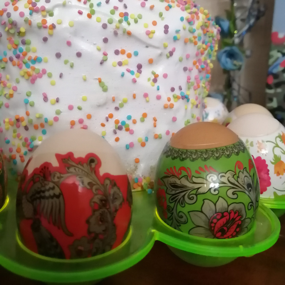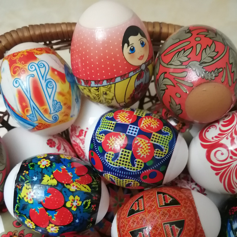 Мама любит хохлому, потому купила ей эту серию. Красивый дизайн, яркие краски, хотя яйца были домашние не с белой скорлупой. Всё равно смотрится очень эффективно. Подходят на любой размер, даже экстра. Стоит брать