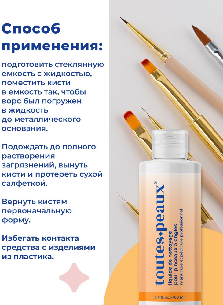 Очиститель для кистей — это незаменимое средство для заботы о ваших инструментах маникюра. Жидкость для очистки кистей предназначена для удаления остатков геля, акрила и мономера, которые могут со временем накапливаться на ворсе кисточек. Этот продукт станет вашим надежным помощником как в домашних условиях, так и в профессиональных салонах красоты. Использование средства для чистки кистей для маникюра не только облегчает процесс очистки, но и обеспечивает долговечность и сохранность ваших инструментов. Благодаря своей уникальной формуле, жидкость аккуратно растворяет загрязнения, не повреждая структуру ворса. Вы сможете вернуть кистям их первоначальный вид, что особенно важно для поддержания качества маникюра и педикюра.