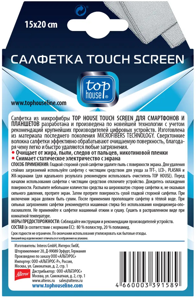 Салфетка для смартфонов и планшетов Top House «Touch Screen» специально разработана и произведена по новейшей технологии с учетом рекомендаций крупнейших производителей мобильных цифровых устройств. Изготовлена из нетканого безворсового материала последнего поколения Microfibers Technology. Сверхтонкие волокна обрабатывают микропоры очищаемой поверхности, благодаря чему легко и быстро удаляются любые загрязнения.