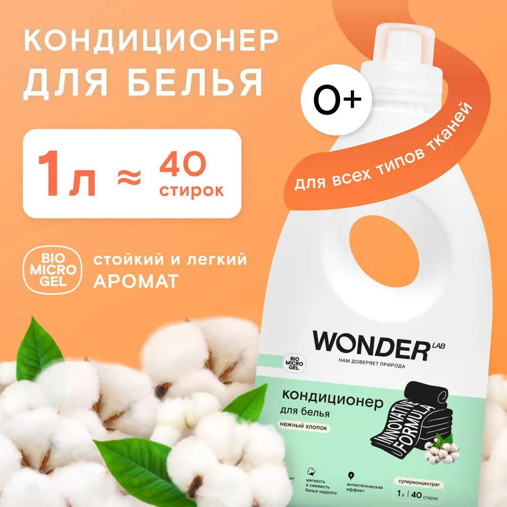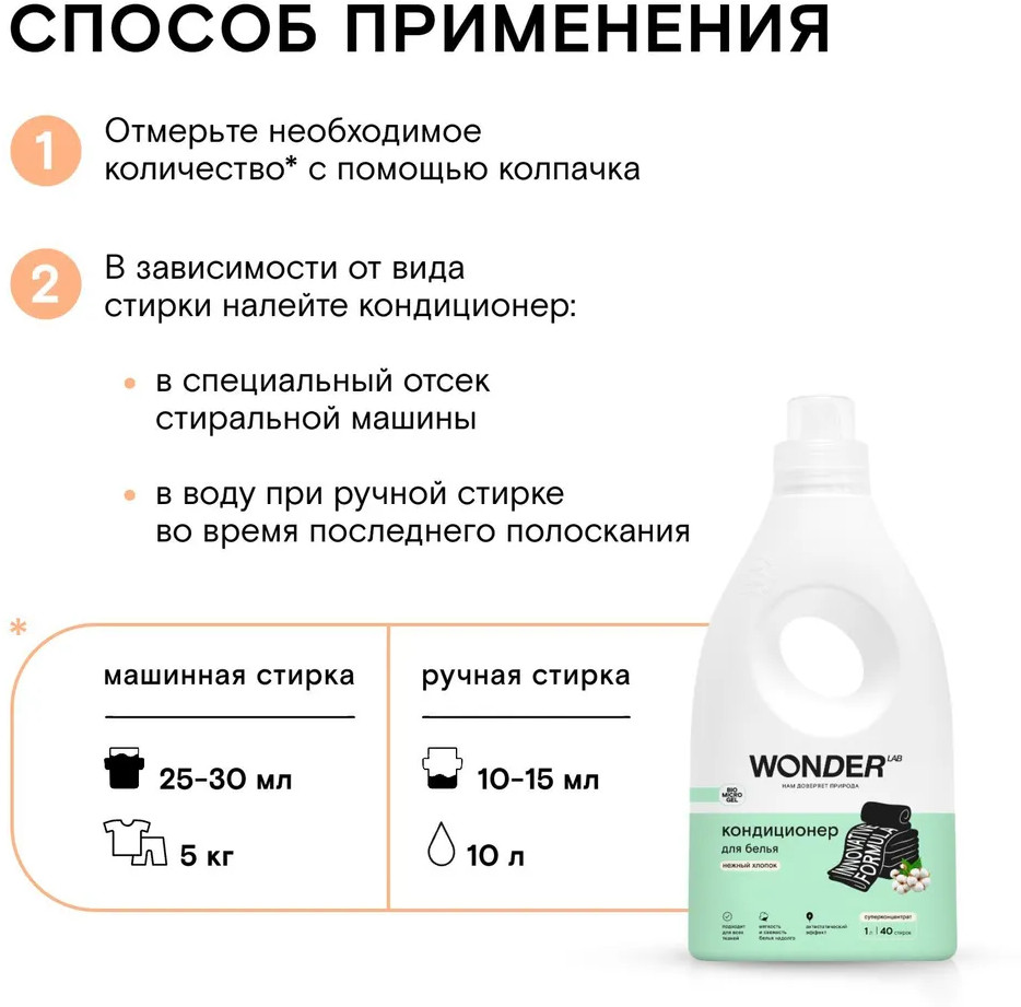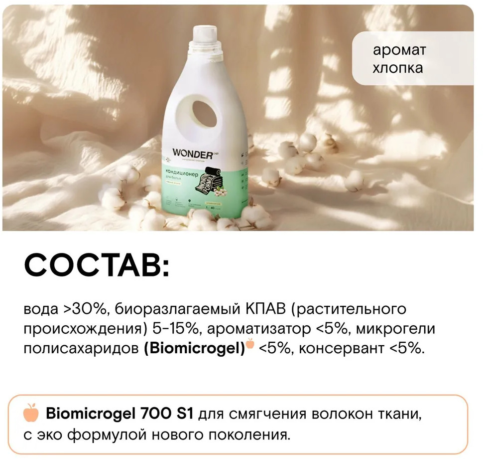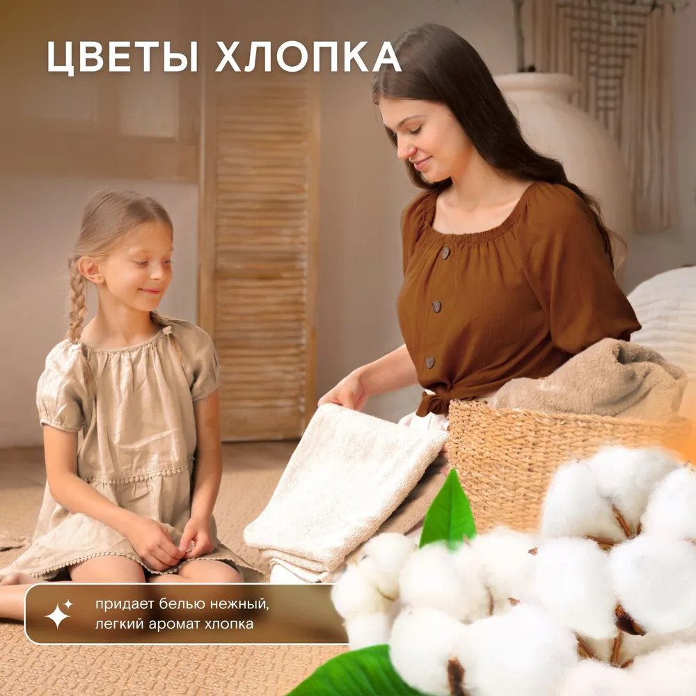 Безопасный и ароматный кондиционер предназначен смягчения белья из всех типов ткани. Придаёт белью незабываемый аромат нежного хлопка, мягкость и свежесть, убирает статическое электричество, облегчает глажку. Подходит для ручной и машинной стирки, сохраняет текстуру ткани. Придает белью легкий, невесомый аромат, без резких отдушек и стойких ароматов. Благодаря новой формуле Biomicrogel великолепно смягчает ткань, делая её исключительно мягкой и нежной. Подходит для стирки детской и спортивной одежды.