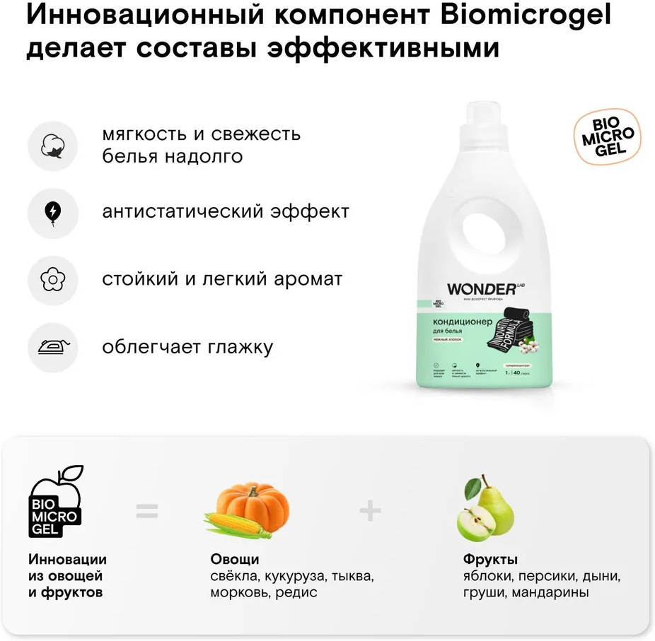 Высокая безопасность и натуральность кондиционера основана на инновационной технологии Biomicrogel, разработанной на основе растительных компонентов: крахмала, пектина и целлюлозы, которые получают из натуральных фруктов и овощей. Biomicrogel разлагается в окружающей среде на 98 % за 24 часа, поэтому безопасен для всех членов семьи, природы и септиков. Biomicrogel защищает внутренние элементы стиральной машины от накипи.