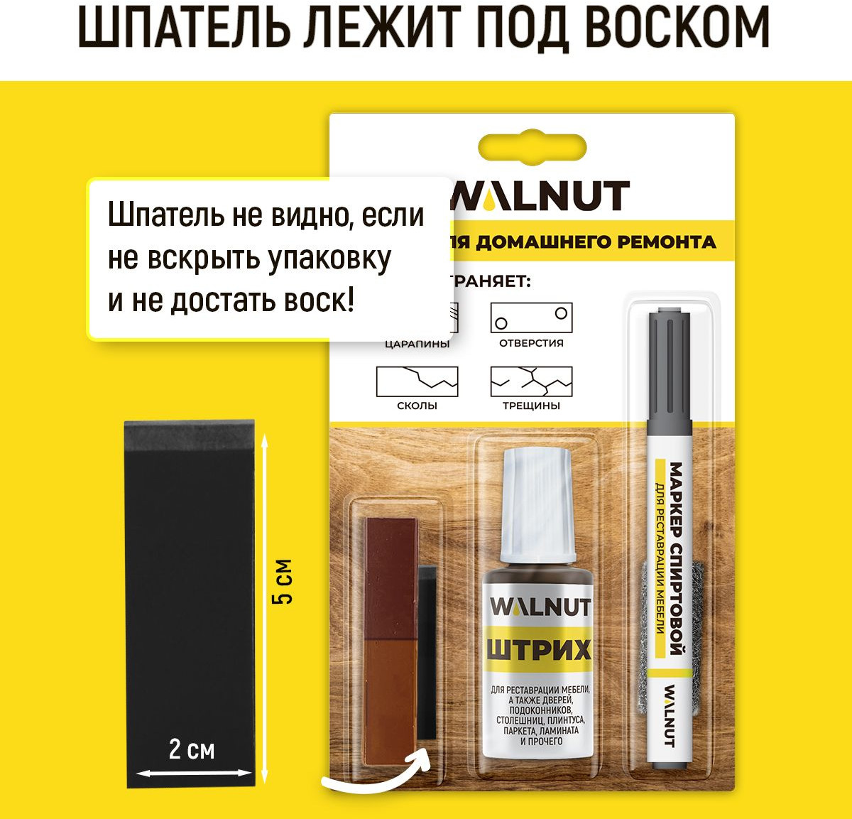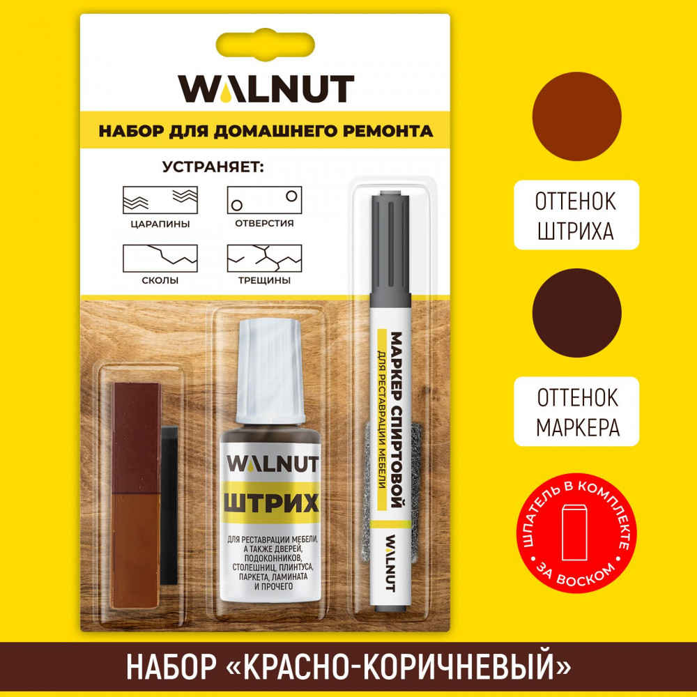 Набор для домашнего ремонта WALNUT предназначен для реставрации мебели, окон, дверей, лестниц, изделий из дерева и пластика. Набор для реставрации мебели подходит для устранения мелких, средних и глубоких повреждений на деревянных, ламинированных и пластиковых поверхностях: потертостей, царапин, трещин, стыков и швов.