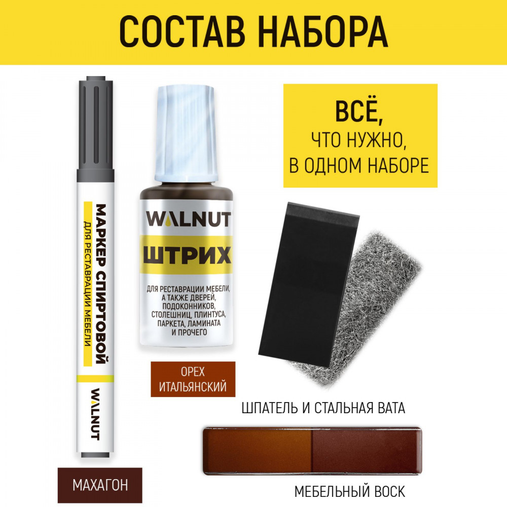 Набор для ремонта и реставрации включает в себя мебельный штрих, спиртовой мебельный маркер и два оттенка мягкого мебельного воска. В комплект также входит шпатель а и стальная вата для устранения остатков средств с реставрируемой поверхности, а также для шлифовки древесины, ЛДСП, пластика и других материалов. Подробная инструкция по использованию каждого средства находится среди фотографий товара, а также на обратной стороне упаковки.