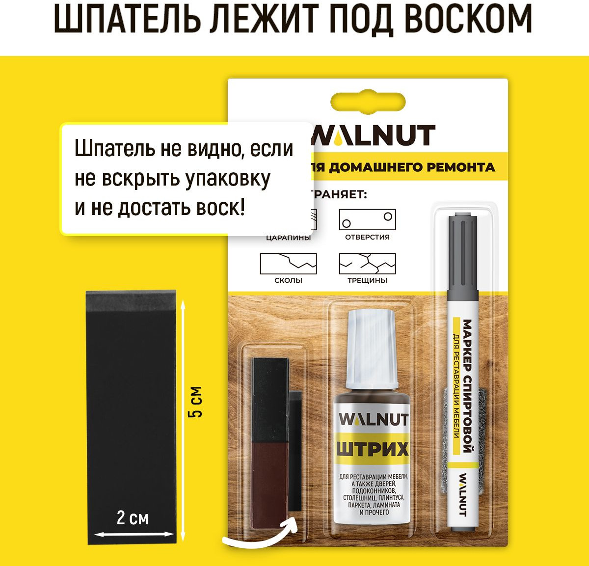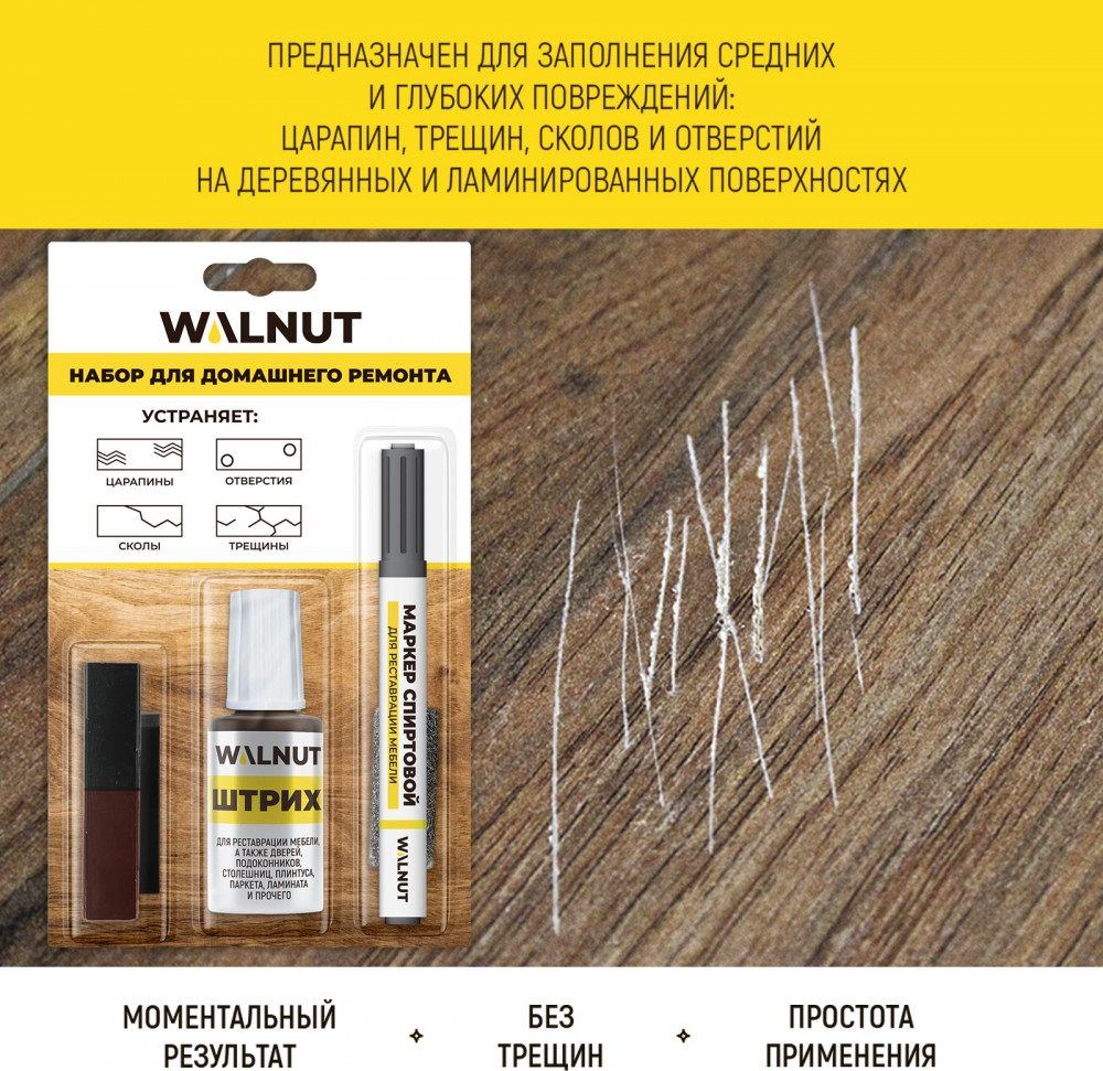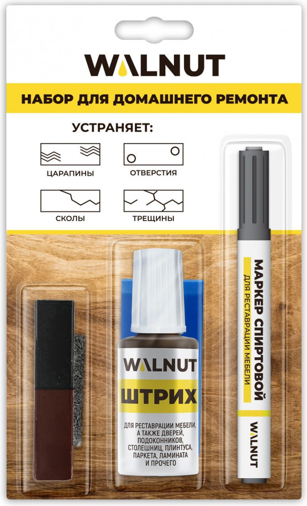 Набор для домашнего ремонта WALNUT предназначен для реставрации мебели, окон, дверей, лестниц, изделий из дерева и пластика. Набор для реставрации мебели подходит для устранения мелких, средних и глубоких повреждений на деревянных, ламинированных и пластиковых поверхностях: потертостей, царапин, трещин, стыков и швов.