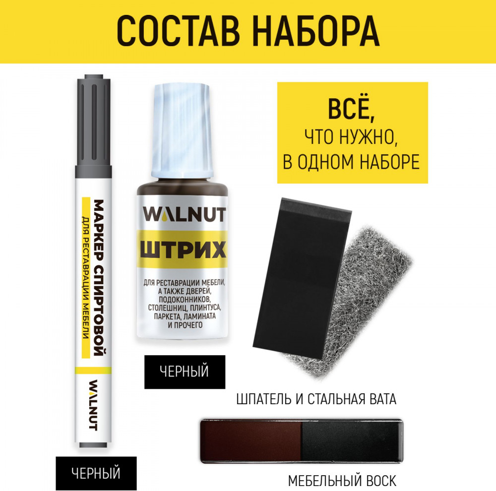 Набор для ремонта и реставрации включает в себя мебельный штрих, спиртовой мебельный маркер и два оттенка мягкого мебельного воска. В комплект также входит шпатель а и стальная вата для устранения остатков средств с реставрируемой поверхности, а также для шлифовки древесины, ЛДСП, пластика и других материалов. Подробная инструкция по использованию каждого средства находится среди фотографий товара, а также на обратной стороне упаковки.