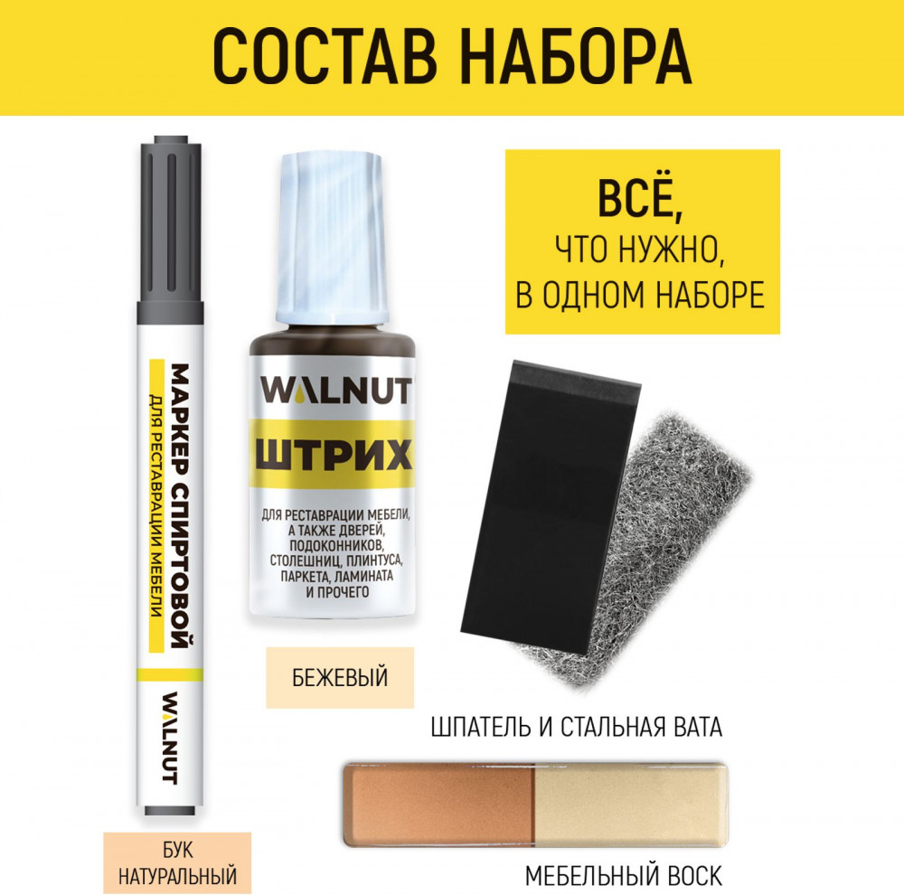 Набор для ремонта и реставрации включает в себя мебельный штрих, спиртовой мебельный маркер и два оттенка мягкого мебельного воска. В комплект также входит шпатель а и стальная вата для устранения остатков средств с реставрируемой поверхности, а также для шлифовки древесины, ЛДСП, пластика и других материалов. Подробная инструкция по использованию каждого средства находится среди фотографий товара, а также на обратной стороне упаковки.