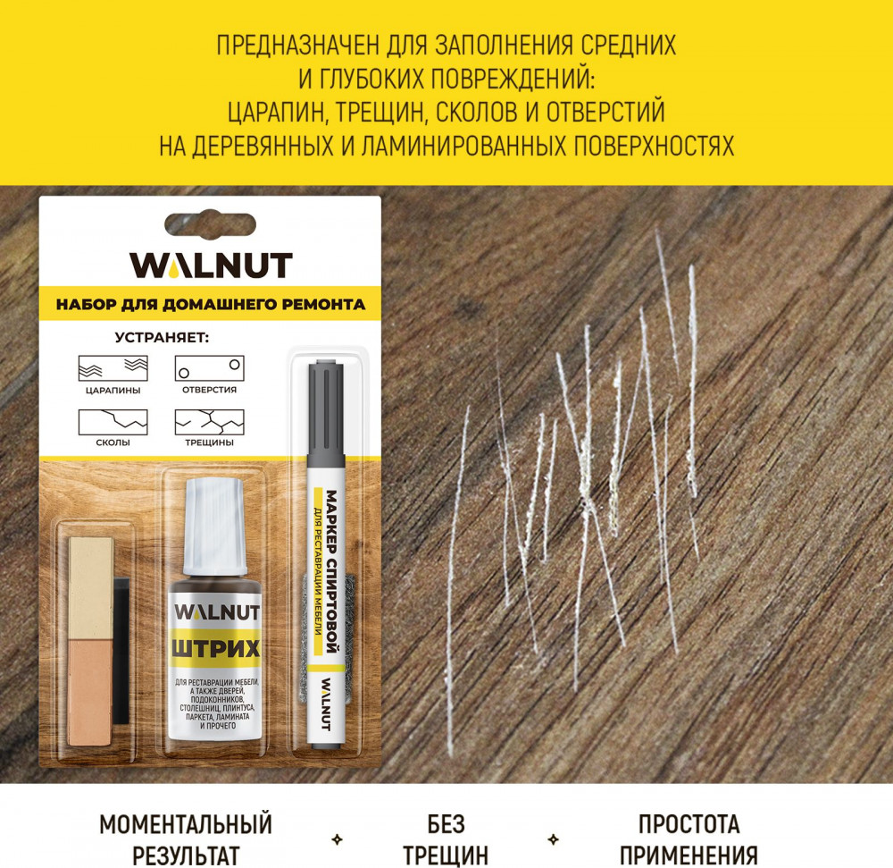 Набор для домашнего ремонта WALNUT предназначен для реставрации мебели, окон, дверей, лестниц, изделий из дерева и пластика. Набор для реставрации мебели подходит для устранения мелких, средних и глубоких повреждений на деревянных, ламинированных и пластиковых поверхностях: потертостей, царапин, трещин, стыков и швов.