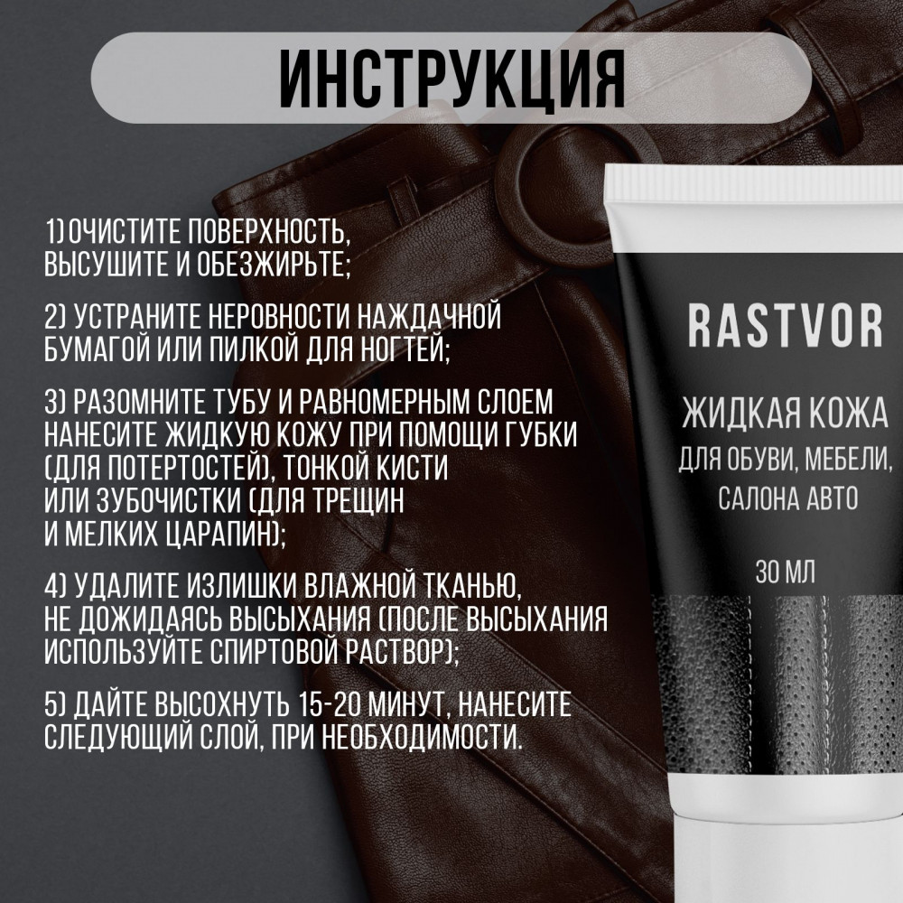 Способ применения: очистите поверхность, высушите и обезжирьте; устраните неровности наждачной бумагой или пилкой для ногтей; разомните тубу и равномерным слоем нанесите жидкую кожу при помощи губки (для потертостей), тонкой кисти или зубочистки (для трещин и мелких царапин); удалите излишки влажной тканью, не дожидаясь высыхания (после высыхания используйте спиртовой раствор); дайте высохнуть 15-20 минут, нанесите следующий слой, при необходимости. Полное время высыхания изделия: ~ 24 часа. Не применять для изделий из замши, нубука и велюра. Для получения наиболее подходящего оттенка рекомендуется выбрать 2-3 цвета жидкой кожи схожего тона и смешать между собой.