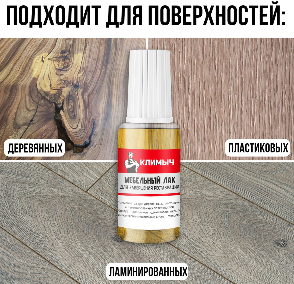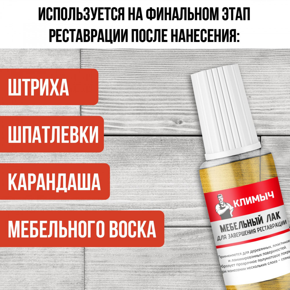 Прозрачный фиксирующий лак предназначен для обработки деревянных, пластиковых и ламинированных поверхностей на финальном этапе реставрации или ремонта, после применения таких материалов, как твердый и мягкий мебельный воск, штрих, карандаш или шпаклевка. Он подходит для мебели, изделий из дерева или пластика, предметов декора интерьера, дверей, паркетного пола или ламината. Состав применяется не только для восстановления лакокрасочного покрытия, но и в творчестве. Данный продукт создает надежный водостойкий слой, который защищает отреставрированные поверхности от внешних воздействий и механических повреждений. Один слой формирует почти матовое покрытие, а при нанесении нескольких — глянцевое.