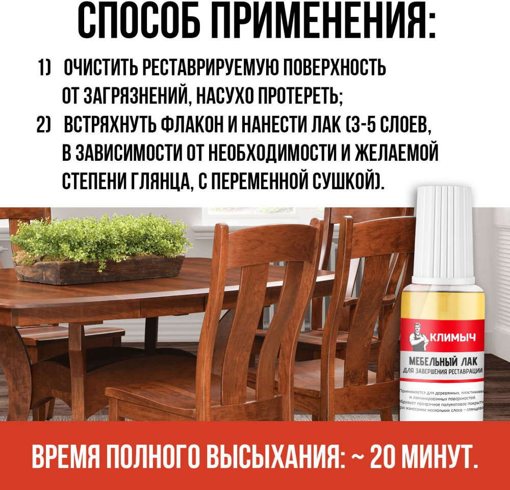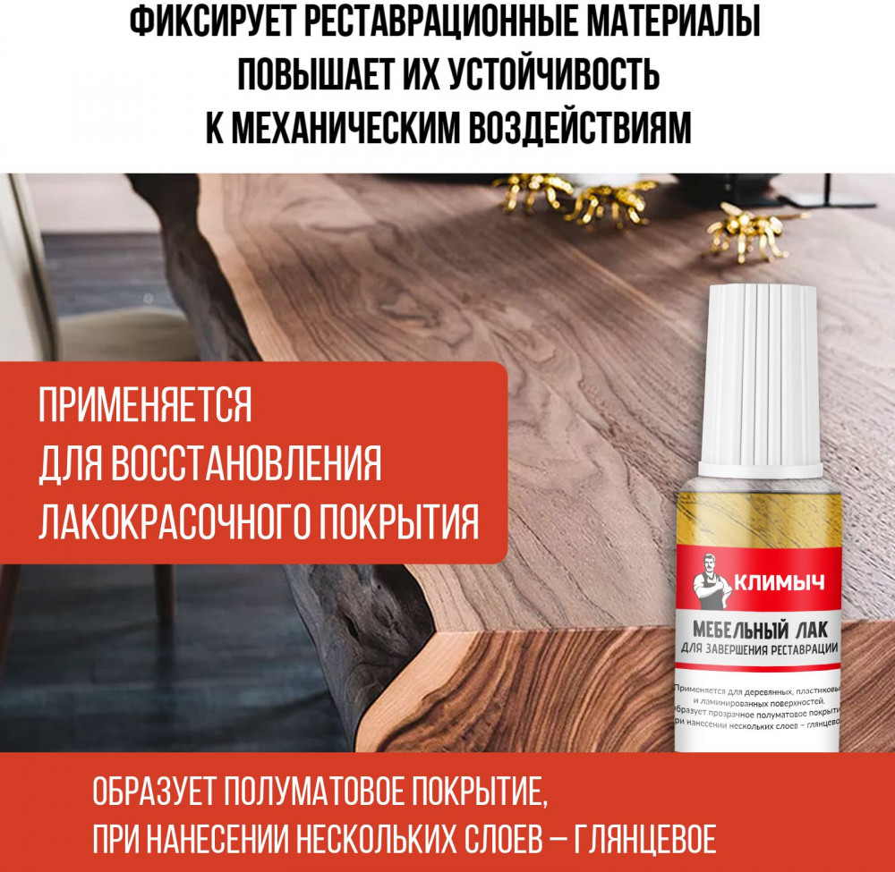 Использовать средство очень просто, благодаря удобному флакону с кисточкой. Очистите поверхность от грязи или пыли, тщательно ее просушите. Встряхните флакон и нанесите состав в несколько слоев с попеременной просушкой (обычно достаточно 3-5, в зависимости от желаемой степени глянца). Полное высыхания занимает около 20 минут, после чего отреставрированное изделие готово к использованию. В составе продукта нитроцеллюлоза, растворители и модифицирующие добавки, которые обеспечивают высокую прочность и устойчивость к внешним воздействиям. Фиксирующий бесцветный лак является незаменимым инструментом для восстановления и защиты различных покроев от дальнейших повреждений в доме или офисе. Он защитит паркет или другие напольные покрытия, мебель, столешницу от образования на них царапин, трещин или потертостей.