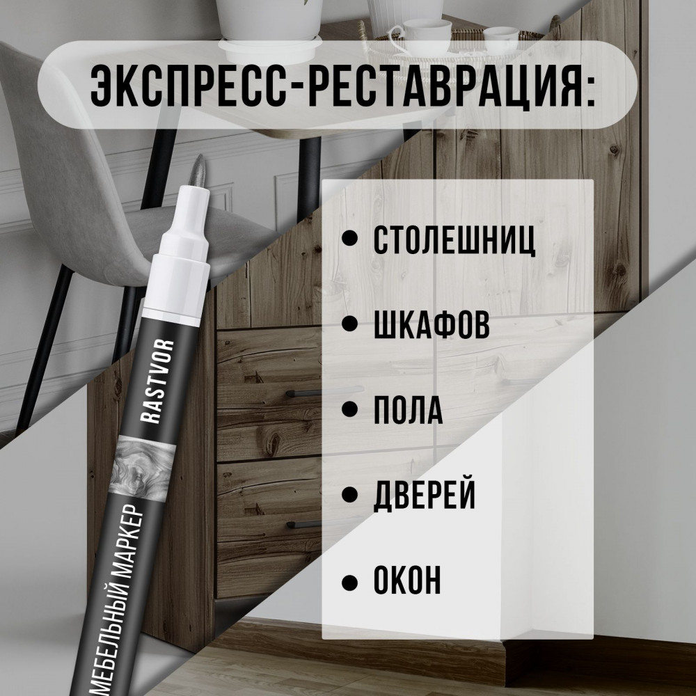 Мебельный маркер — это универсальный продукт для быстрой и эффективной реставрации деревянных изделий во всем доме. Средство на акриловой основе подходит для покрытия царапин и повреждений как на мебели, так и на других поверхностях. Классический белый цвет краски вписывается в интерьер, будь то кухня или гостиная. Данный материал поможет восстановить эстетический вид изделий из дерева и пластика, например, кухонных шкафов, стола или двери.