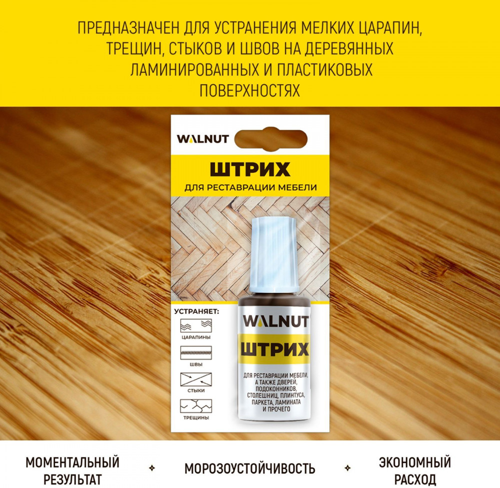 Штрих предназначен для реставрации мебели, дверей, подоконников, столешниц, плинтуса, паркета, ламината. Мебельный штрих подходит для устранения мелких царапин, трещин, стыков и швов на деревянных, ламинированных и пластиковых поверхностях, подверженных интенсивной эксплуатации.