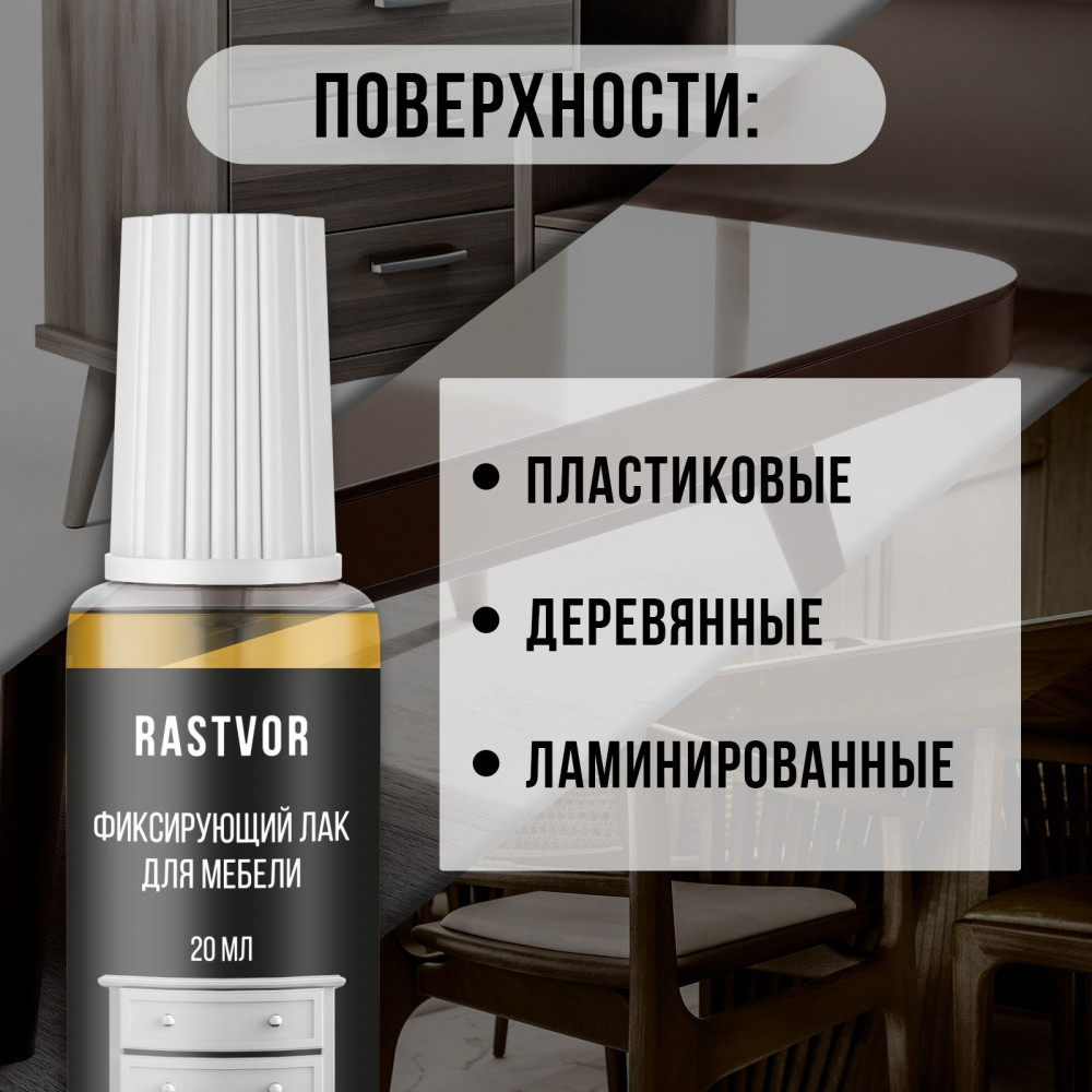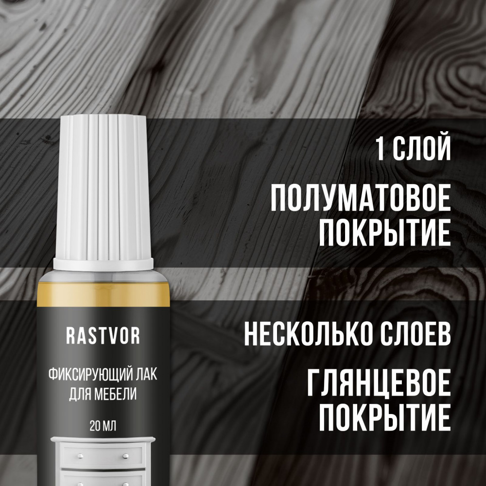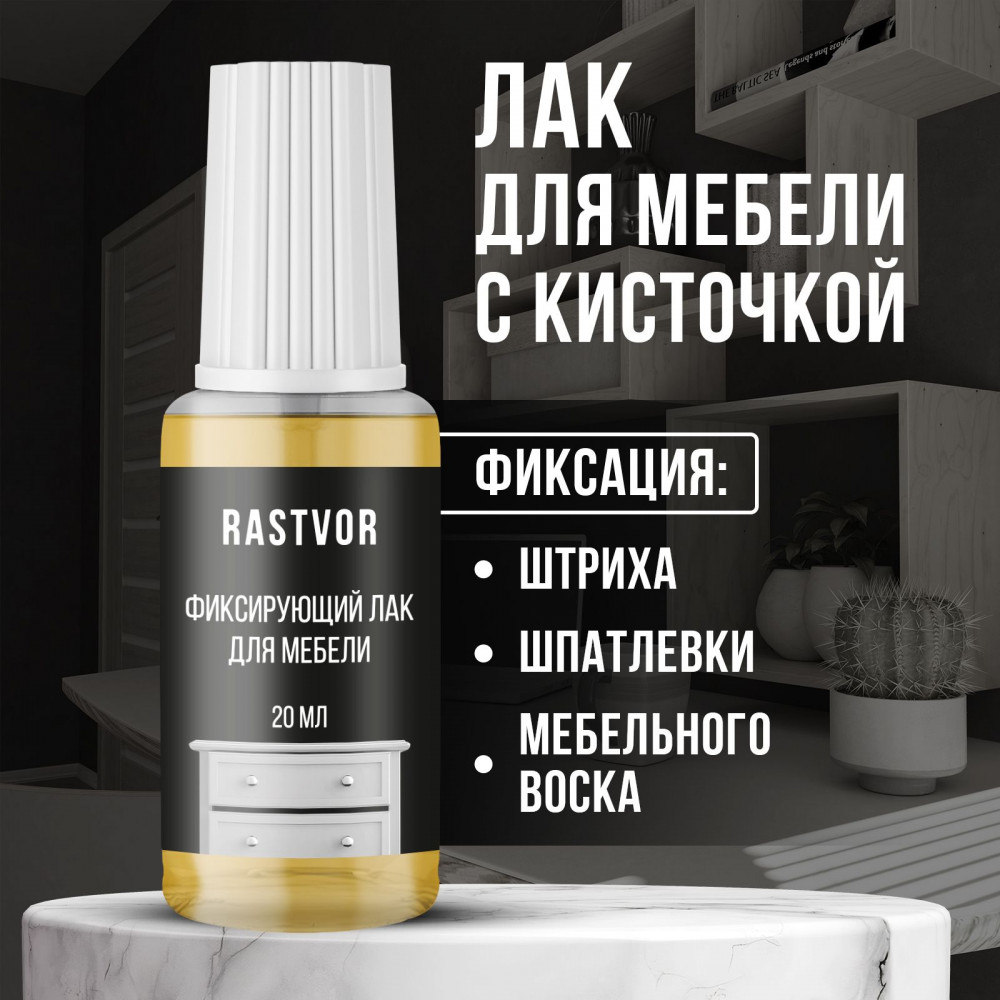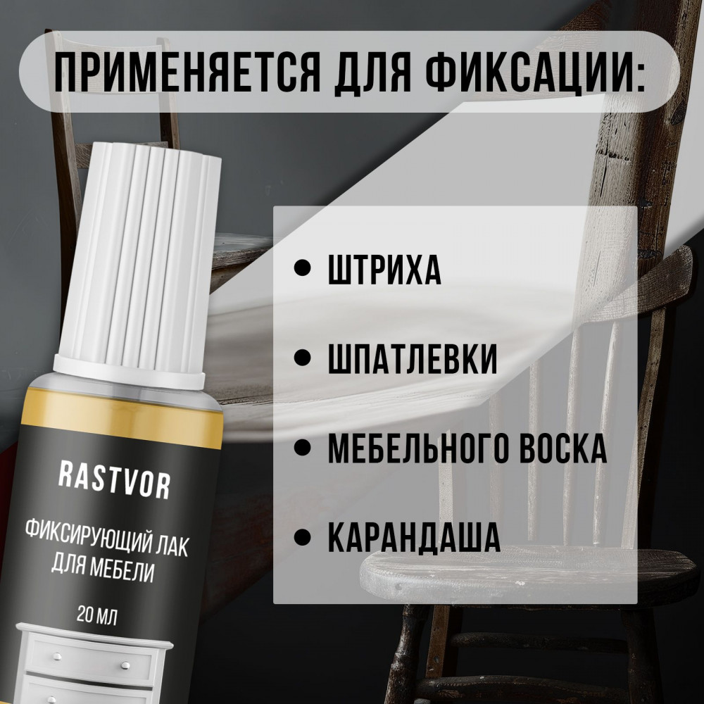 Фиксирующий лак для мебели — это идеальное средство для профессиональной обработки и реставрации деревянных изделий. Он отлично подходит в качестве финишного покрытия после использования мебельного штриха, шпатлевки, воска или карандаша, а также для творчества, например, для картин, написанных маслом или акриловыми красками. Уникальная формула продукта обеспечивает надежную защиту и долговечное покрытие столешниц, пола, шкафов и дверей, предотвращает появление царапин и потертостей. Этот материал идеально подходит для использования на различных поверхностях, таких как дерево, ламинат и паркет. Прозрачный финишный лак создает матовый эффект, подчеркивая натуральную красоту древесины и сохраняя ее текстуру, а при нанесении нескольких слоев — глянцевое, усиливая блеск изделий.