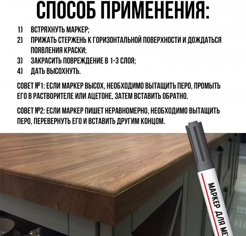 Советы: если маркер высох, необходимо вытащить перо, промыть его в растворителе или ацетоне, затем вставить обратно. Также если маркер пишет неравномерно, необходимо вытащить перо, перевернуть его и вставить другим концом. Этот полезный инструмент станет прекрасным дополнением в ремонтном наборе вашего дома, который поможет обновить интерьер: пол, плинтус, дверь или окно. Он хорошо справится с повреждениями на комоде, письменном или компьютерном столе, стуле или на других вещах из дерева, пластика или металла, сохраняя уют, порядок и чувство новизны.