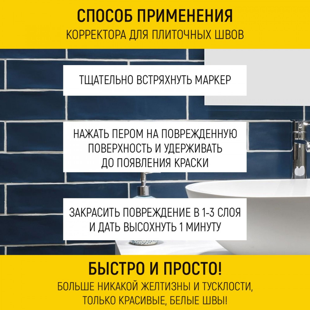 Маркер для плиточных швов предназначен для обновления старых кафельных швов: закрашивания, коррекции и придания им белоснежно белого цвета. Благодаря содержащимся в чернилах фунгицидам, маркер для затирки кафельных швов предотвращает появление плесневого грибка. Состав ложится густым, плотным слоем, быстро сохнет, не растекается и не осыпается. Максимальная толщина линии – 3 мм. Корректор для плиточных швов подходит для применения в местах повышенной влажности: в ванной и на кухне. В комплект входят 2 сменных наконечника.