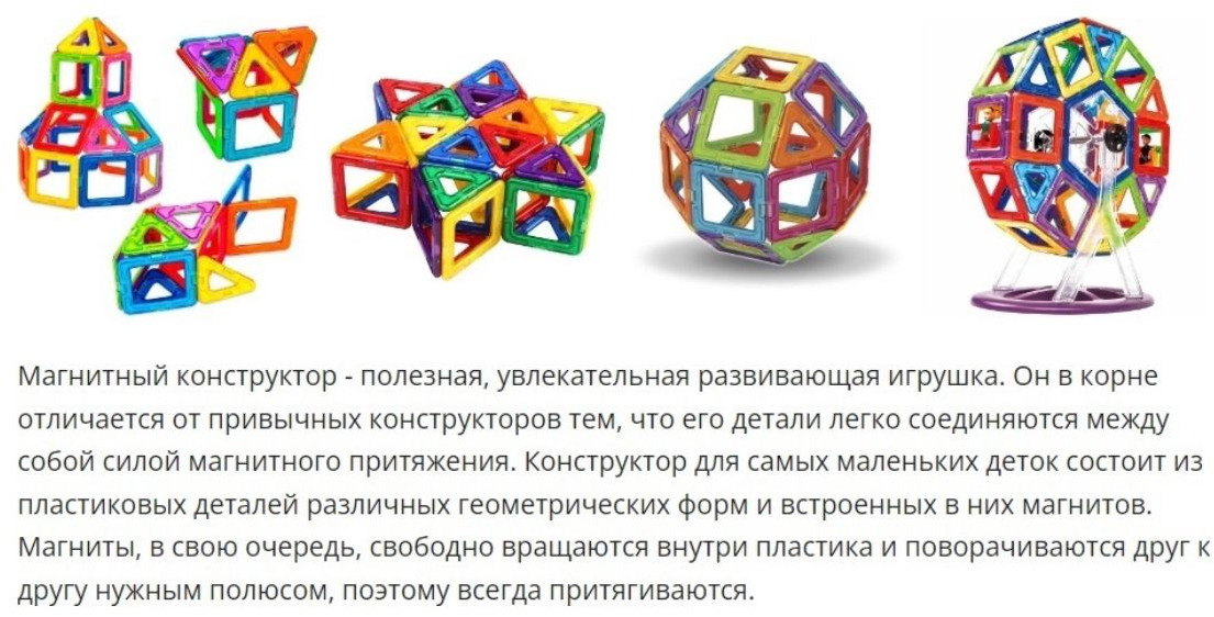 Индокитай Конструктор магнитныйВ данный момент этот товар отсутствует в продаже. Возможно, у нас найдется аналогичный или похожий товар здесь. Магнитный конструктор — идеальный выбор для развития вашего ребёнка! Откройте мир безграничных возможностей с нашим уникальным набором магнитных деталей. Магнитный конструктор — это не просто игрушка, это инструмент для развития логического мышления, пространственного воображения и мелкой моторики рук. Ваш ребёнок будет часами собирать различные фигуры, развивая усидчивость и терпение. |