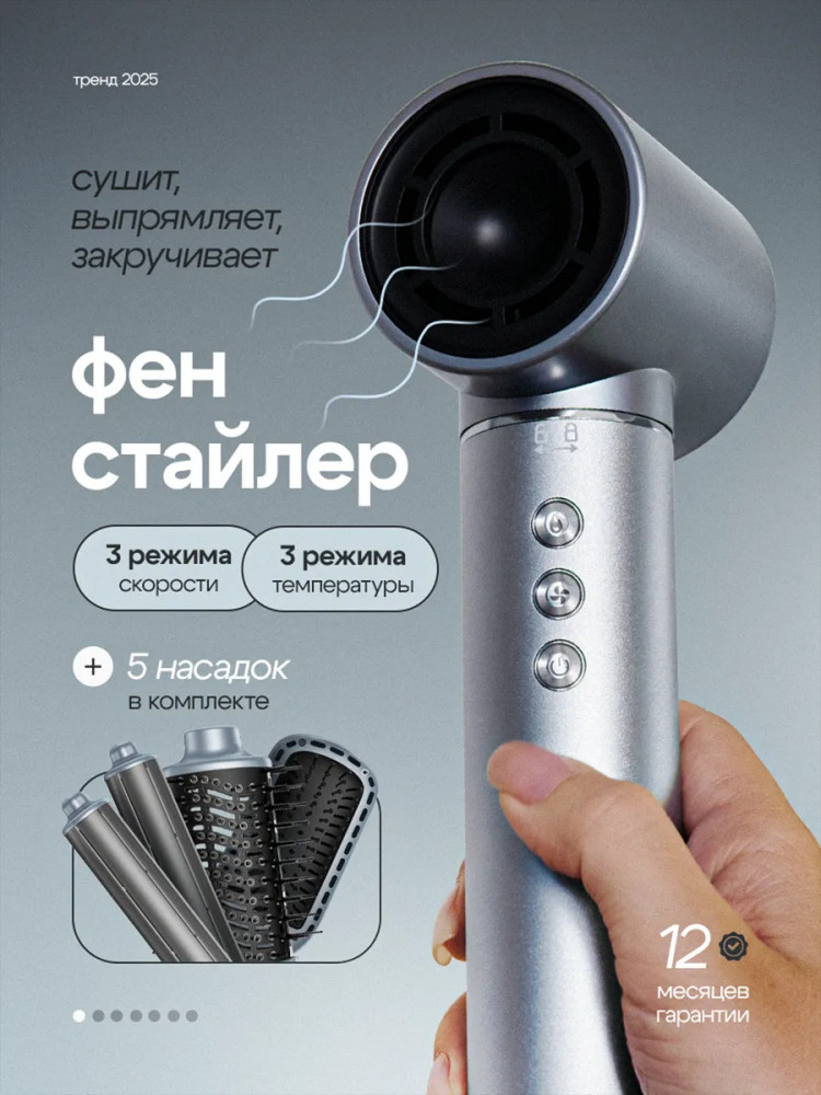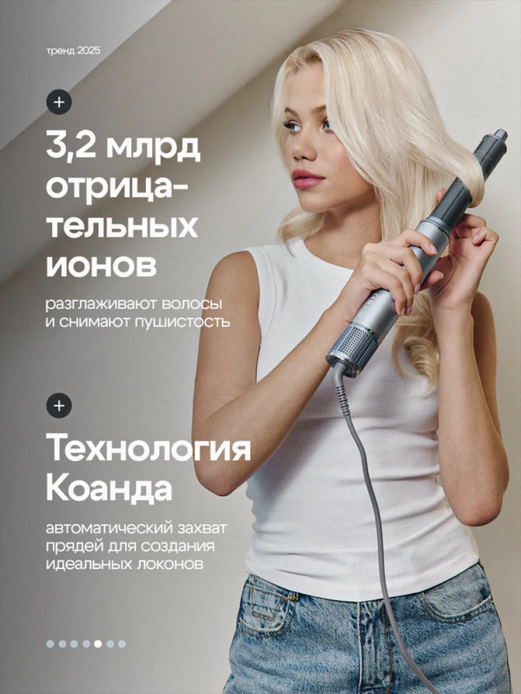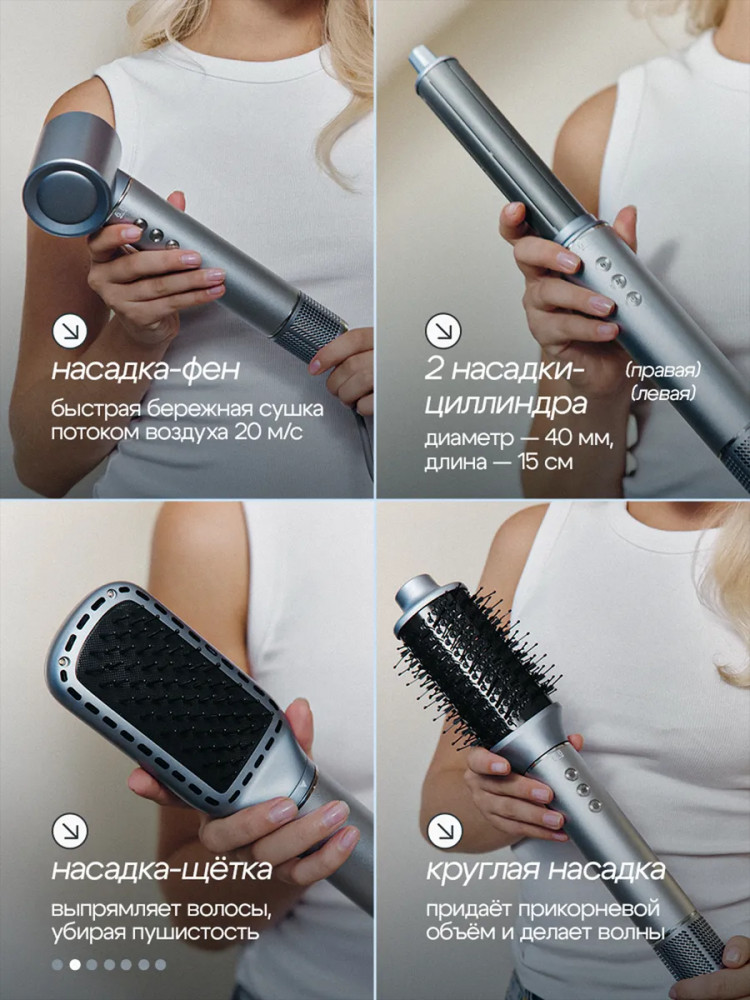 Этот электрический фен-щетка с ионизацией и мощным безщеточным двигателем — универсальный прибор, который подходит для коротких и длинных волос, создания прикорневого объема, фиксации причесок и укладки челки. Его можно использовать для моделирования прямых прядей, кудряшек, пушистых и волнистых волос. Фен-стайлер 5 в 1 — универсальный прибор для профессионального ухода за волосами. Подходит для сушки, выпрямления, создания объема и завивки.