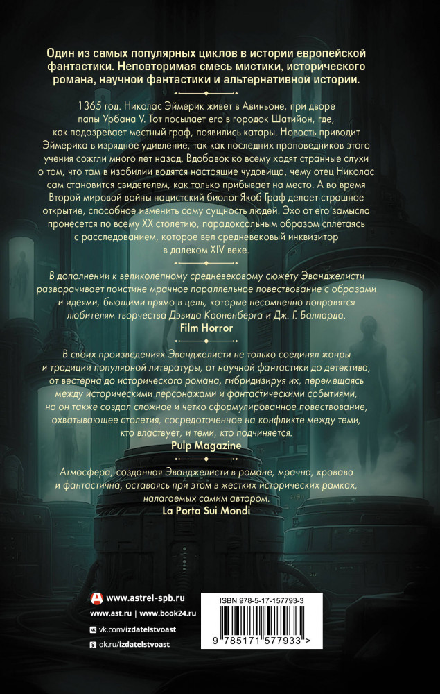 💳 Оплатить за товар можно при получении 🇰🇿 Есть бесплатная доставка по Казахстану от 1 дня 🎁 Копите бонусы с каждой покупки Серия: Великий Инквизитор 1365 год. Николас Эймерик живет в Авиньоне, при дворе папы Урбана V. Тот посылает его в городок Шатийон, где, как подозревает местный граф, появились катары. Новость приводит Эймерика в изрядное удивление, так как последних проповедников этого учения сожгли много лет назад. Вдобавок ко всему ходят странные слухи о том, что там в изобилии водятся настоящие чудовища, чему отец Николас сам становится свидетелем, как только прибывает на место. А во время Второй мировой войны нацистский биолог Якоб Граф делает страшное открытие, способное изменить саму сущность людей. Эхо от его замысла пронесется по всему XX столетию, парадоксальным образом сплетаясь с расследованием, которое вел средневековый инквизитор в далеком XIV веке. |