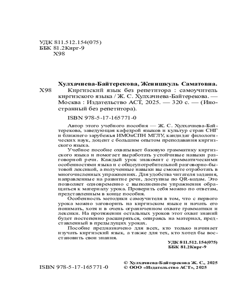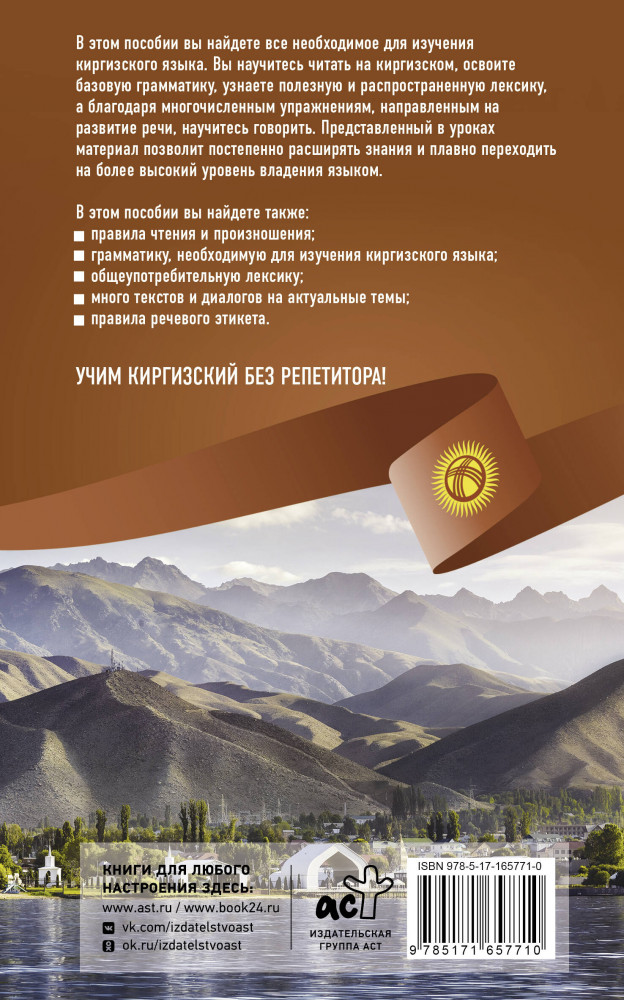 💳 Оплатить за товар можно при получении 🇰🇿 Есть бесплатная доставка по Казахстану от 1 дня 🎁 Копите бонусы с каждой покупки Серия: Иностранный без репетитора Автор этого учебного пособия — Ж. С. Хулхачиева-Байтерекова, заведующая кафедрой языков и культур стран СНГ и ближнего зарубежья ИМОиСПН МГЛУ, кандидат филологических наук, доцент с большим опытом преподавания киргизского языка. Учебное пособие охватывает базовую грамматику киргизского языка и направлено на выработку устойчивых навыков разговорной речи. Каждый урок знакомит с грамматическими особенностями языка и с общеупотребительной разговорно-бытовой лексикой, а полученные навыки вы сможете отработать в многочисленных упражнениях. Для удобства читателя задания, направленные на развитие речи, доступны по QR-кодам: это позволяет одновременно с выполнением упражнения обращаться к материалу урока. Проверить себя можно по ответам, представленным в конце пособия. |