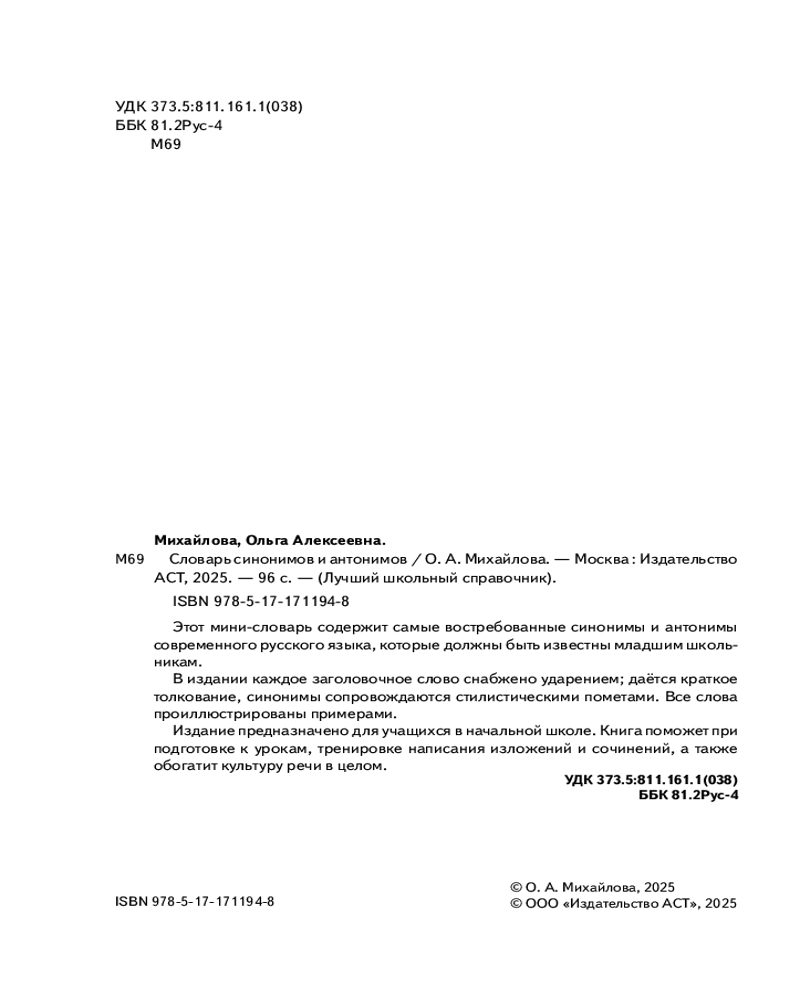 💳 Оплатить за товар можно при получении 🇰🇿 Есть бесплатная доставка по Казахстану от 1 дня 🎁 Копите бонусы с каждой покупки Серия: Лучший школьный справочник Этот мини-словарь содержит самые востребованные синонимы и антонимы современного русского языка, которые должны быть известны младшим школьникам. В издании каждое заголовочное слово снабжено ударением; даётся краткое толкование, синонимы сопровождаются стилистическими пометами. Все слова проиллюстрированы примерами. Издание предназначено для учащихся в начальной школе. Книга поможет при подготовке к урокам, тренировке написания изложений и сочинений, а также обогатит культуру речи в целом. |