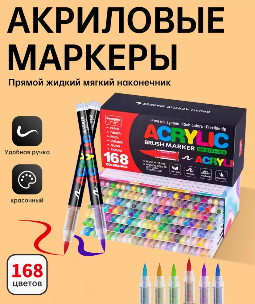 GuangNa Набор маркеров акриловыхВ данный момент этот товар отсутствует в продаже. Возможно, у нас найдется аналогичный или похожий товар здесь. Безопасные и долговечные цветные акриловые маркеры GuangNa без запаха для художников всех возрастов. В наборе 168 штук различных расцветок. Чернила хорошо прилипают к различным поверхностям, обеспечивая водостойкость, устойчивость к выцветанию и яркие результаты. Маркеры обладают насыщенными цветами, рисуют на любых поверхностях, не ограничиваясь бумагой; они отлично подходят для работы с камнем, деревом, керамикой, стеклом, тканью, гипсом, холстом и так далее. Перед использованием маркер нужно встряхнуть. |