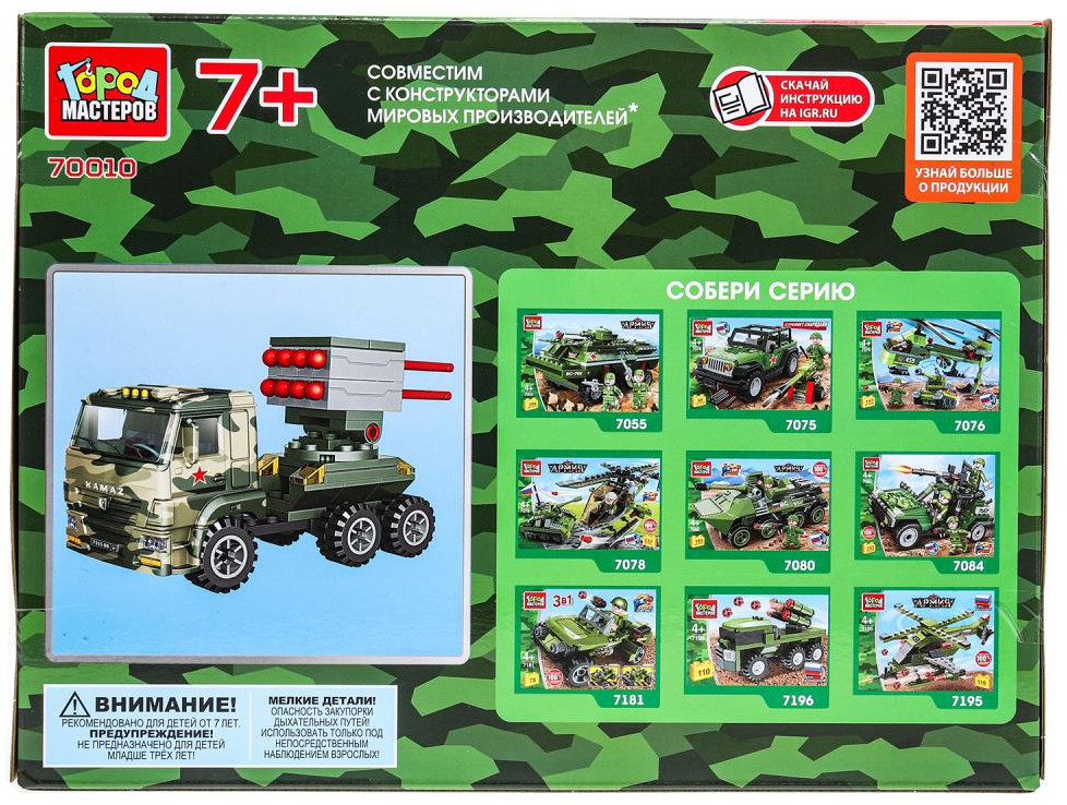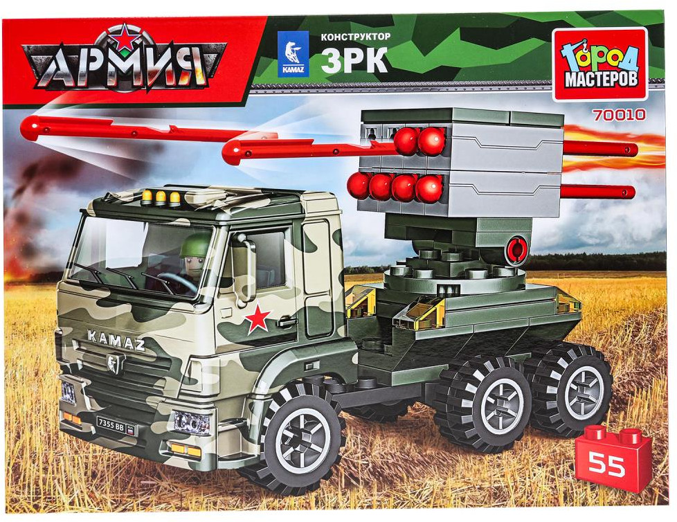 Город мастеров Конструктор «КамАЗ: стреляет ракетами»В данный момент этот товар отсутствует в продаже. Возможно, у нас найдется аналогичный или похожий товар здесь. Серия: Армия Конструктор «КамАЗ: стреляет ракетами» из серии «Армия» ТМ «Город мастеров» непременно понравится маленьким героям. С помощью этого занимательного конструктора ребёнок сможет собрать миниатюрную модель военной техники. Собранные фигурки можно будет использовать в дальнейших играх, придумывая с ними множество увлекательных сюжетов. |
