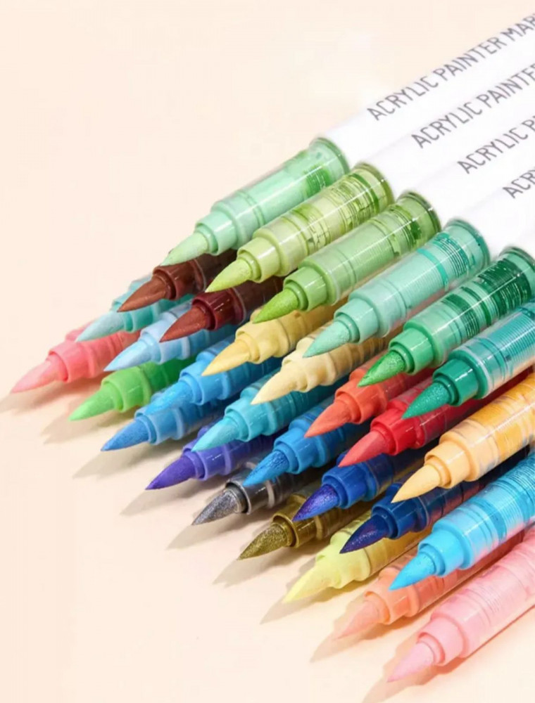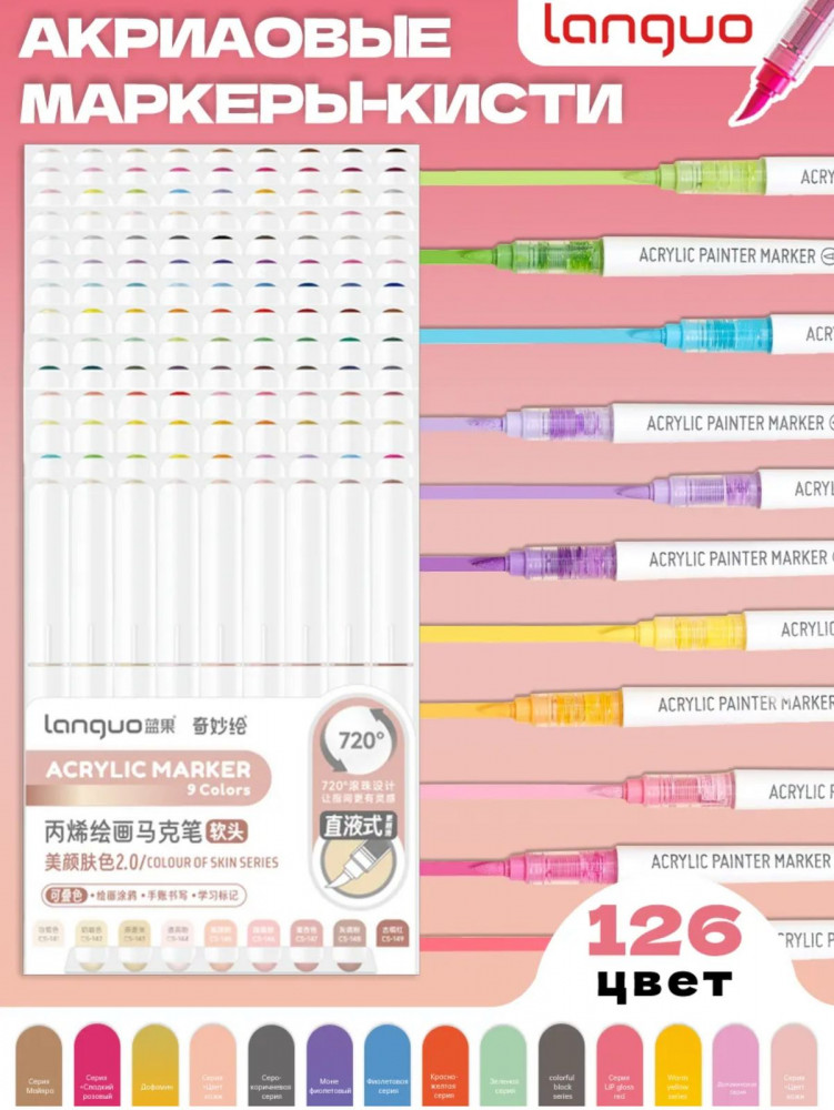 Комплект состоит из 14 наборов по 9 штук различных цветов. Акриловые маркеры Languo предназначены для рисования, декорирования, письма и каллиграфии. Идеально подходят для использования в работе на любых поверхностях, таких как холст, бумага, дерево, пластик, металл.