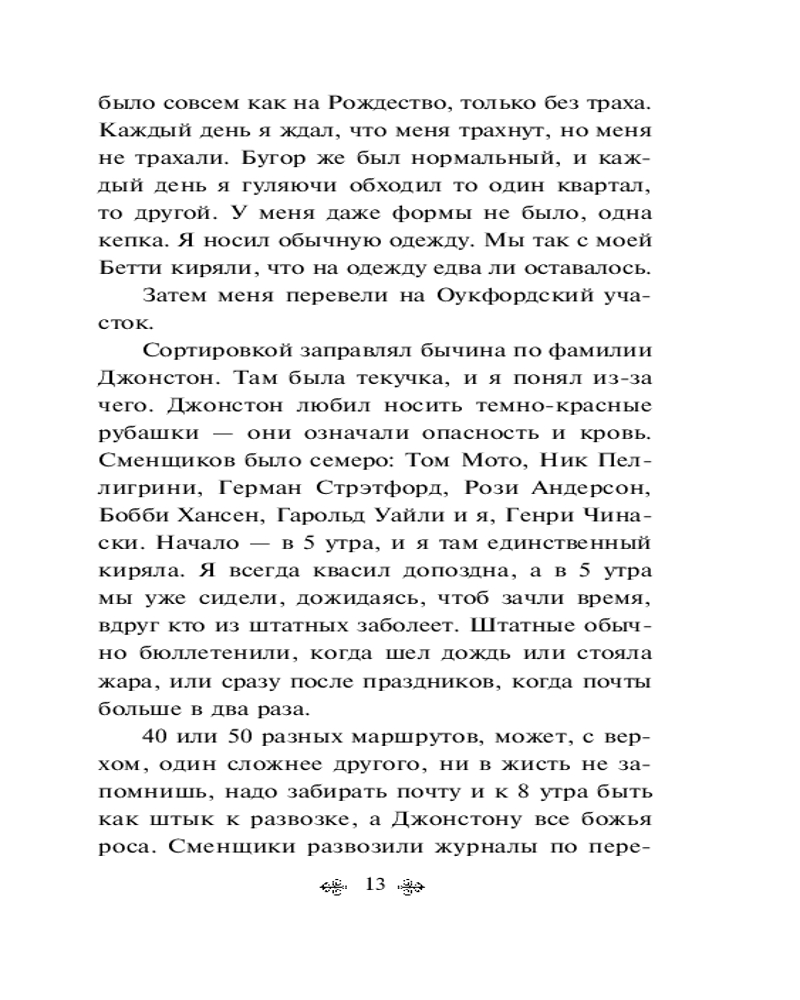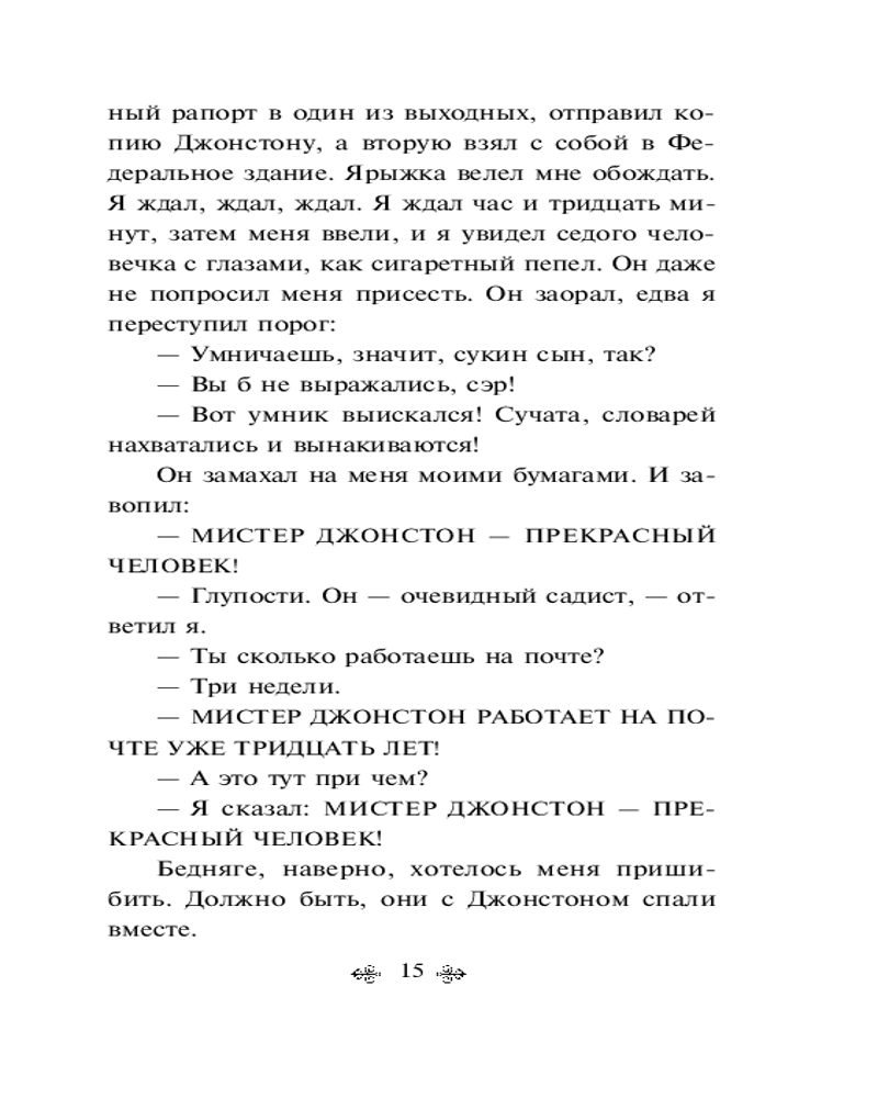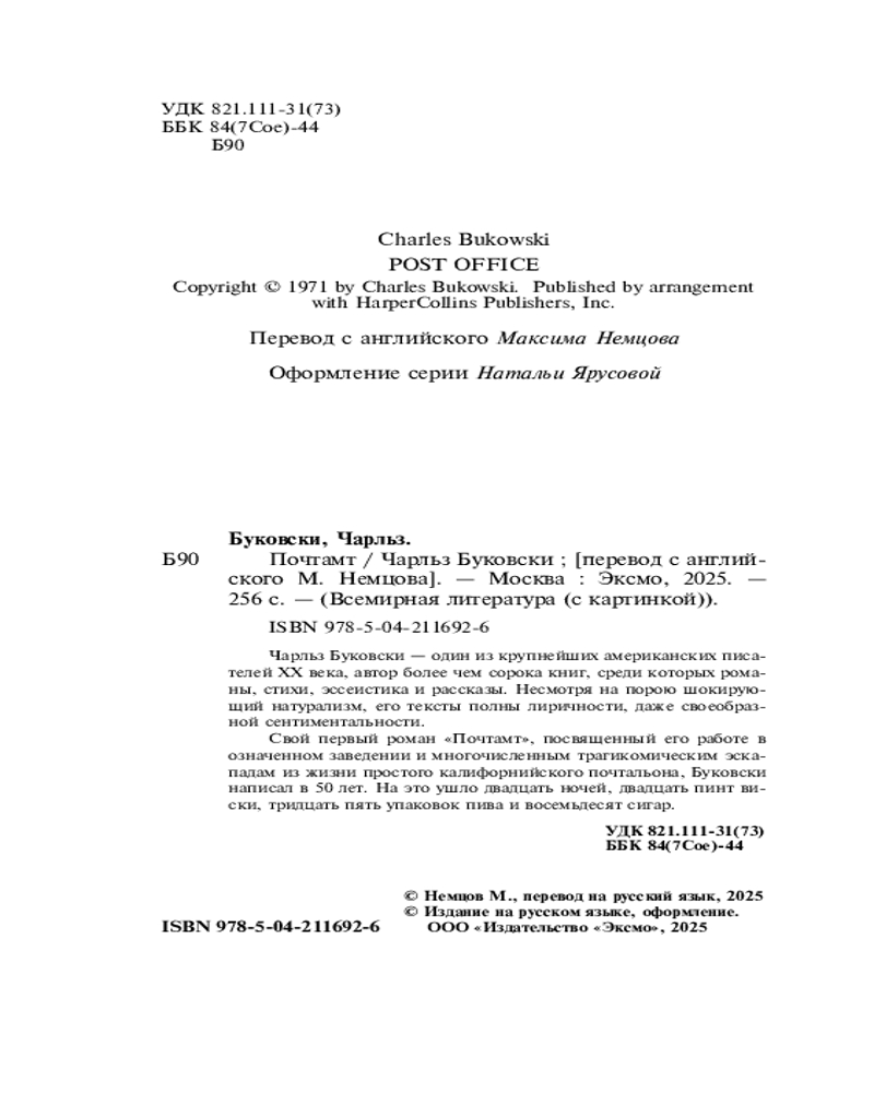 💳 Оплатить за товар можно при получении 🇰🇿 Есть бесплатная доставка по Казахстану от 1 дня 🎁 Копите бонусы с каждой покупки Серия: Всемирная литература (новое оформление) Чарльз Буковски — один из крупнейших американских писателей ХХ века, автор более чем сорока книг, среди которых романы, стихи, эссеистика и рассказы. Несмотря на порою шокирующий натурализм, его тексты полны лиричности, даже своеобразной сентиментальности. Свой первый роман «Почтамт», посвященный его работе в означенном заведении и многочисленным трагикомическим эскападам из жизни простого калифорнийского почтальона, Буковски написал в 50 лет. На это ушло двадцать ночей, двадцать пинт виски, тридцать пять упаковок пива и восемьдесят сигар. |