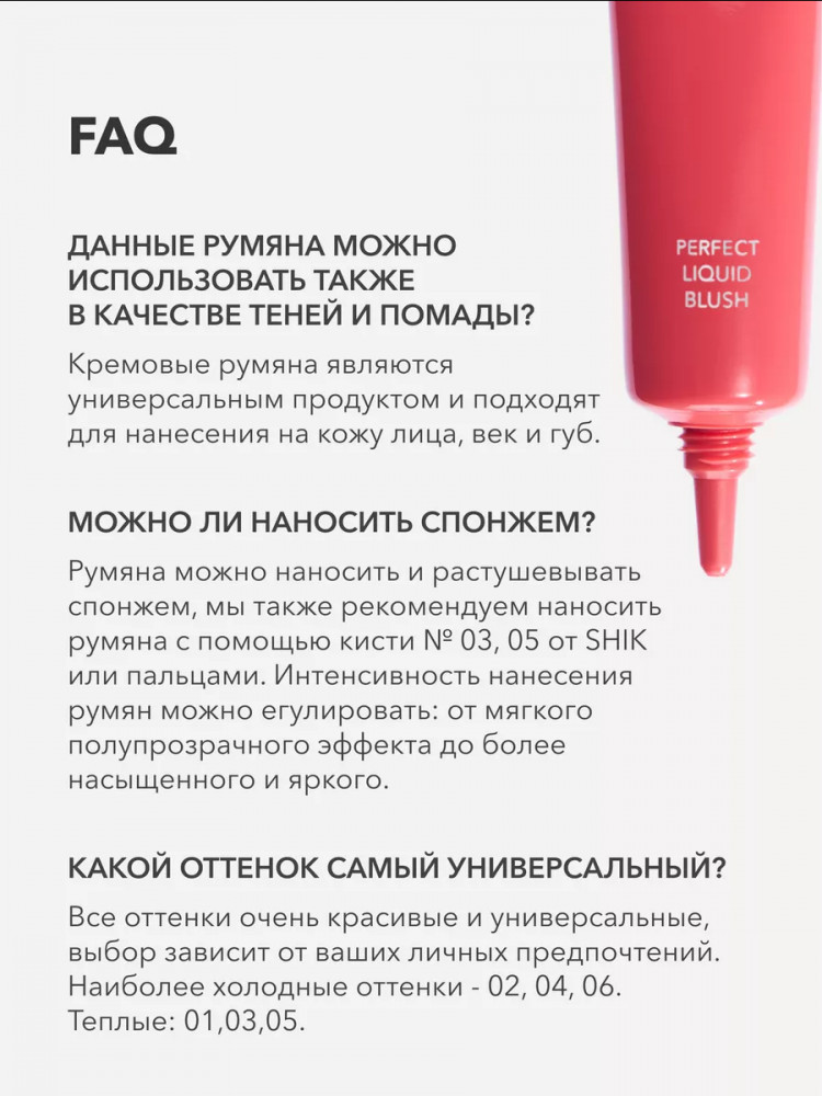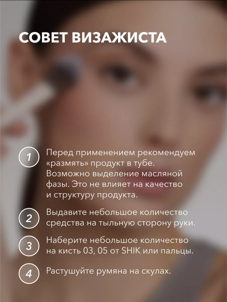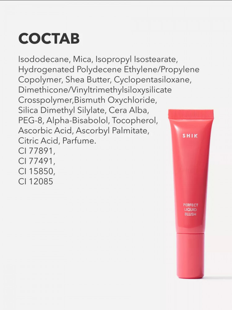 Оттенок мне очень понравился и консистенция, очень полюбились эти румяна Но будьте осторожны в хранении, у меня они лежат в ванной комнате и сегодня открыв вместо привычной кремовой консистенции вылилась какая-то водичка((( румяшкам ну пара месяцев, очень обидно что недавно купила а оно просто вылилось, думаю shik необходимо прописать условия хранения на упаковке