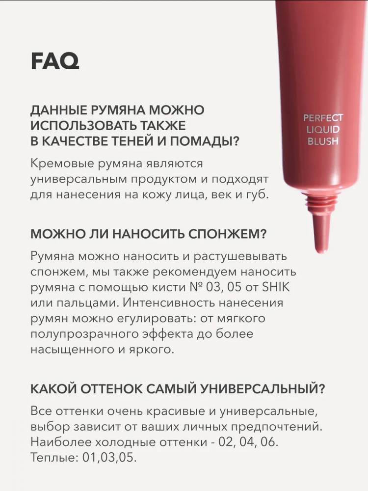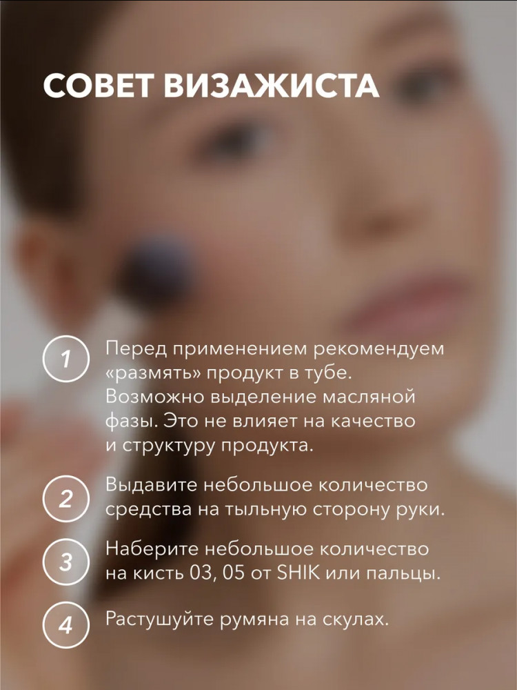 Оттенок мне очень понравился и консистенция, очень полюбились эти румяна Но будьте осторожны в хранении, у меня они лежат в ванной комнате и сегодня открыв вместо привычной кремовой консистенции вылилась какая-то водичка((( румяшкам ну пара месяцев, очень обидно что недавно купила а оно просто вылилось, думаю shik необходимо прописать условия хранения на упаковке
