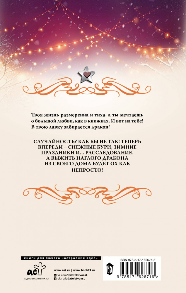💳 Оплатить за товар можно при получении 🇰🇿 Есть бесплатная доставка по Казахстану от 1 дня 🎁 Копите бонусы с каждой покупки Серия: Звезды романтического фэнтези Твоя жизнь размеренна и тиха, а ты мечтаешь о большой любви, как в книжках. И вот на тебе! В твою лавку забирается дракон! Случайность? Как бы не так! Теперь впереди — снежные бури, зимние праздники и... расследование. А выжить наглого дракона из своего дома будет ох как непросто! |